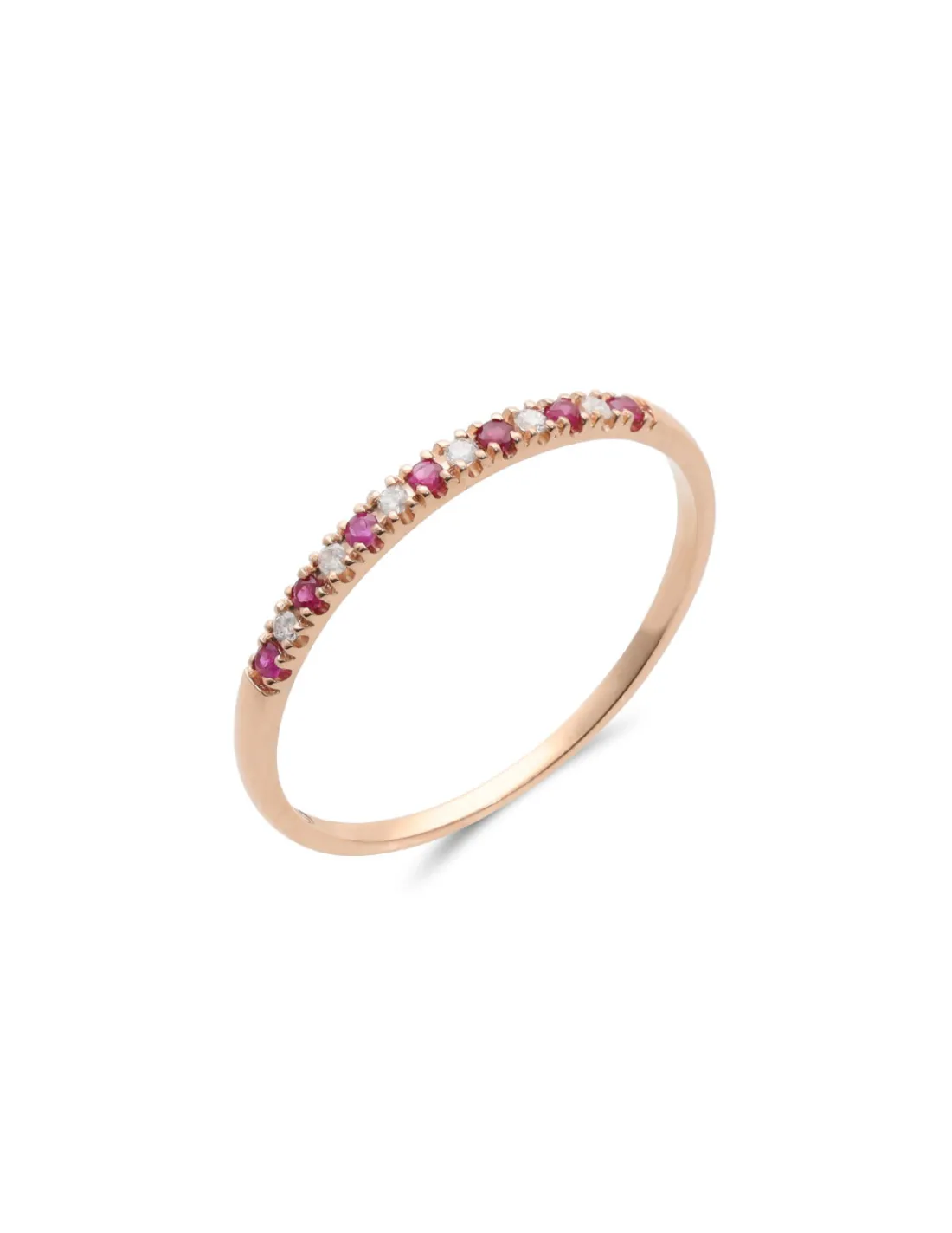 Anillo de oro rosa 1ª Ley (750 mmas) tipo media alianza con rubíes y diamantes. Un diseño de alianza minimalista y versátil con elegantes reflejos de luz.