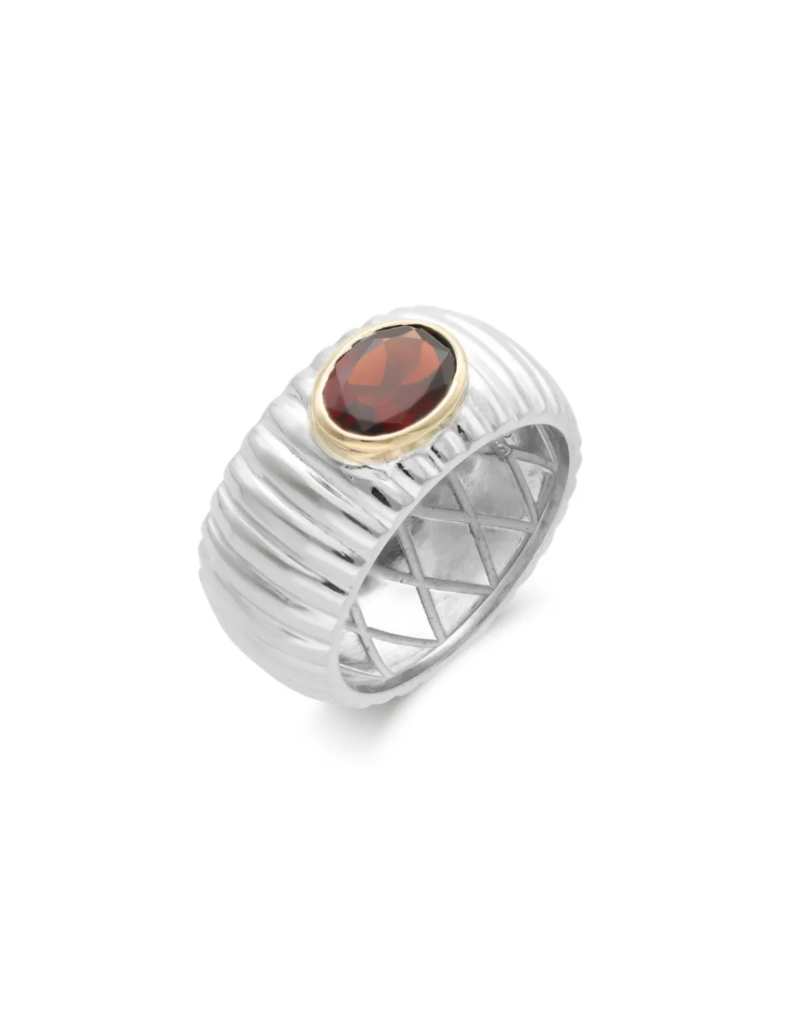 Anillo de plata 1ª Ley (925 mmas) con aro gallonado y granate oval engastada en boquilla de oro amarillo de 9 kt (375 mmas).