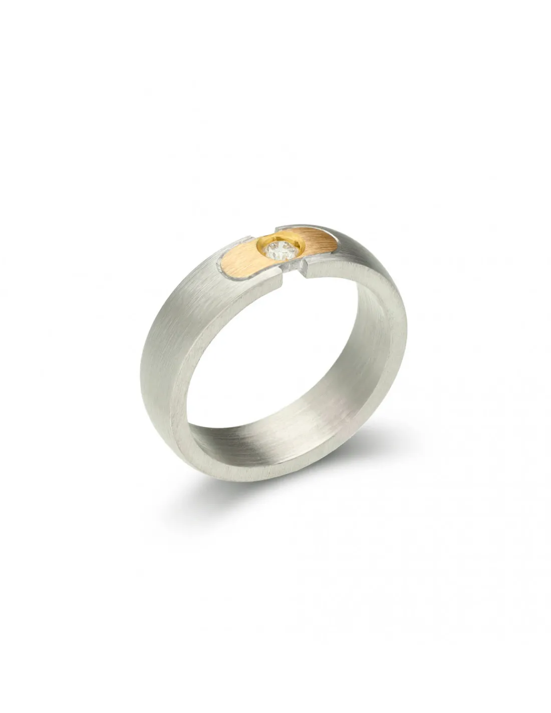 Anillo-Solitario de oro blanco 1ª Ley (750 mmas) con oro amarillo y diamante.