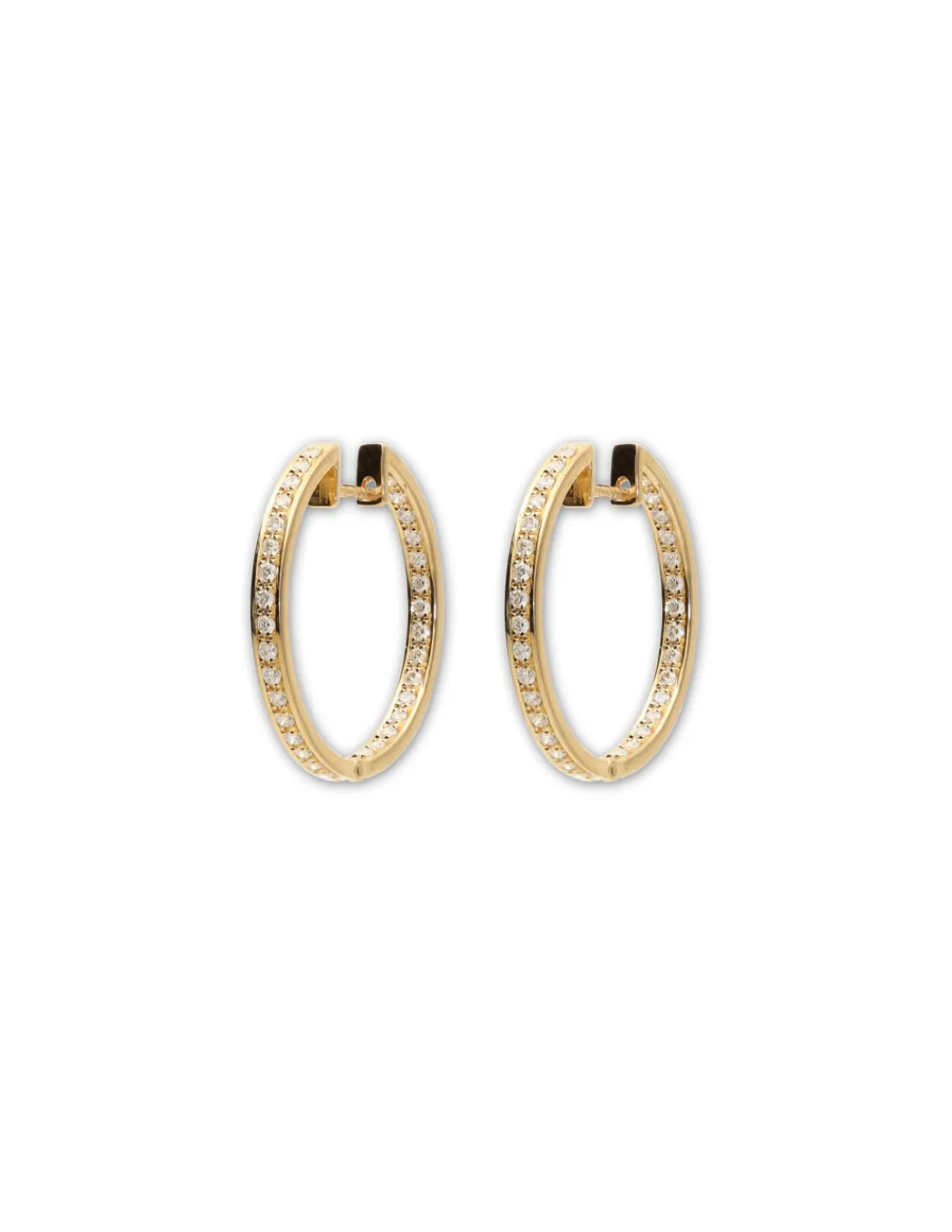 Argollas de oro amarillo 1ª Ley (750 mmas) con forma redonda y diamantes talla brillante engastados en grano en la parte frontal e interior de la argolla. Diámetro aproximado 2,4 cm.