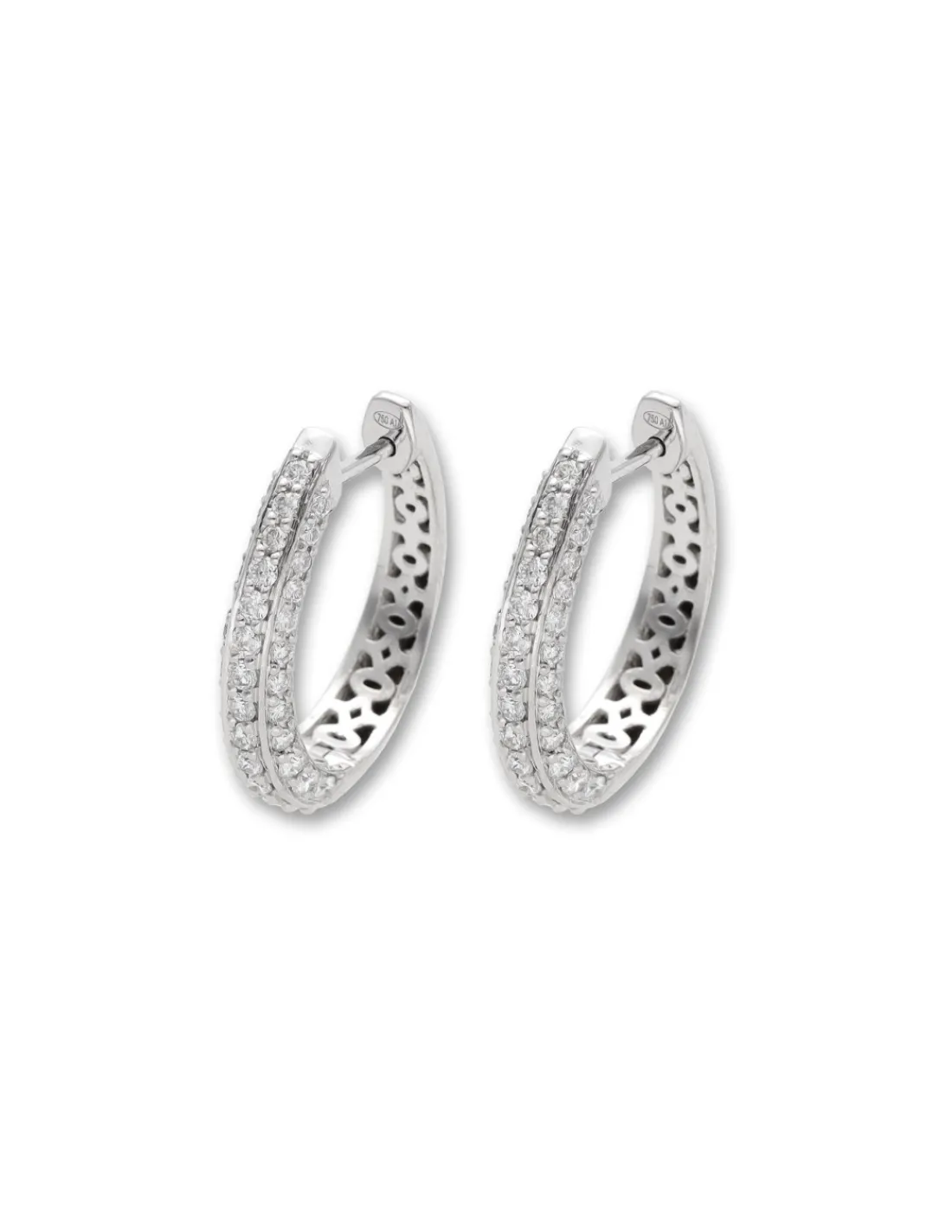 Argollas de oro blanco 1ª Ley (750 mmas) con pavé de diamantes talla brillante engastados en la parte frontal. Tamaño aproximado 2 cm.