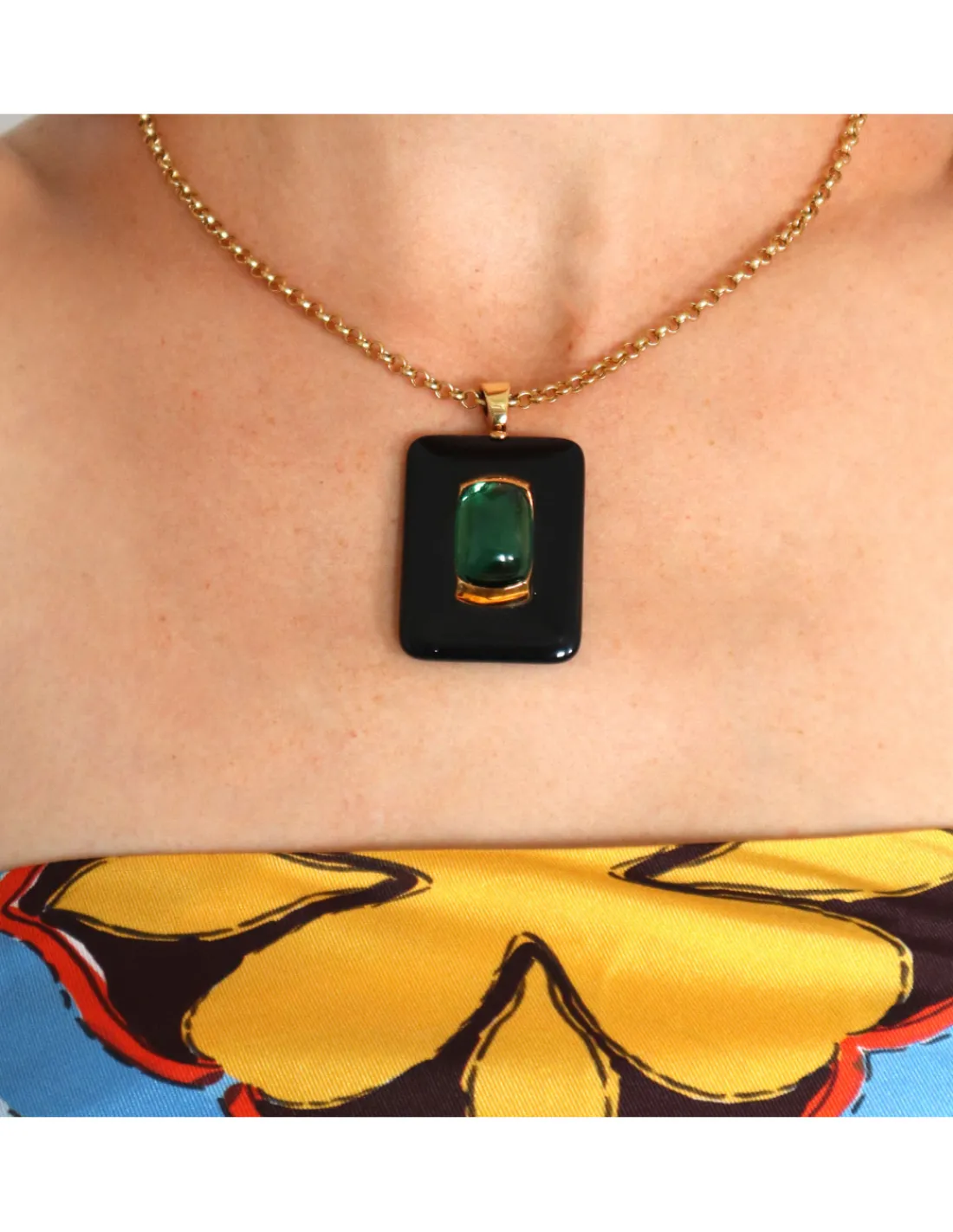 Cadena de oro 1ª ley (750 mmas) con colgante de oro amarillo y ónix rectangular engastado un una turmalina verde cabujón engastada en boquilla. Un colgante único que destaca por su originalidad. Medida aproximada colgante 5 x 3 cm incluyendo asa y reasa. Largo cadena 45 cm.