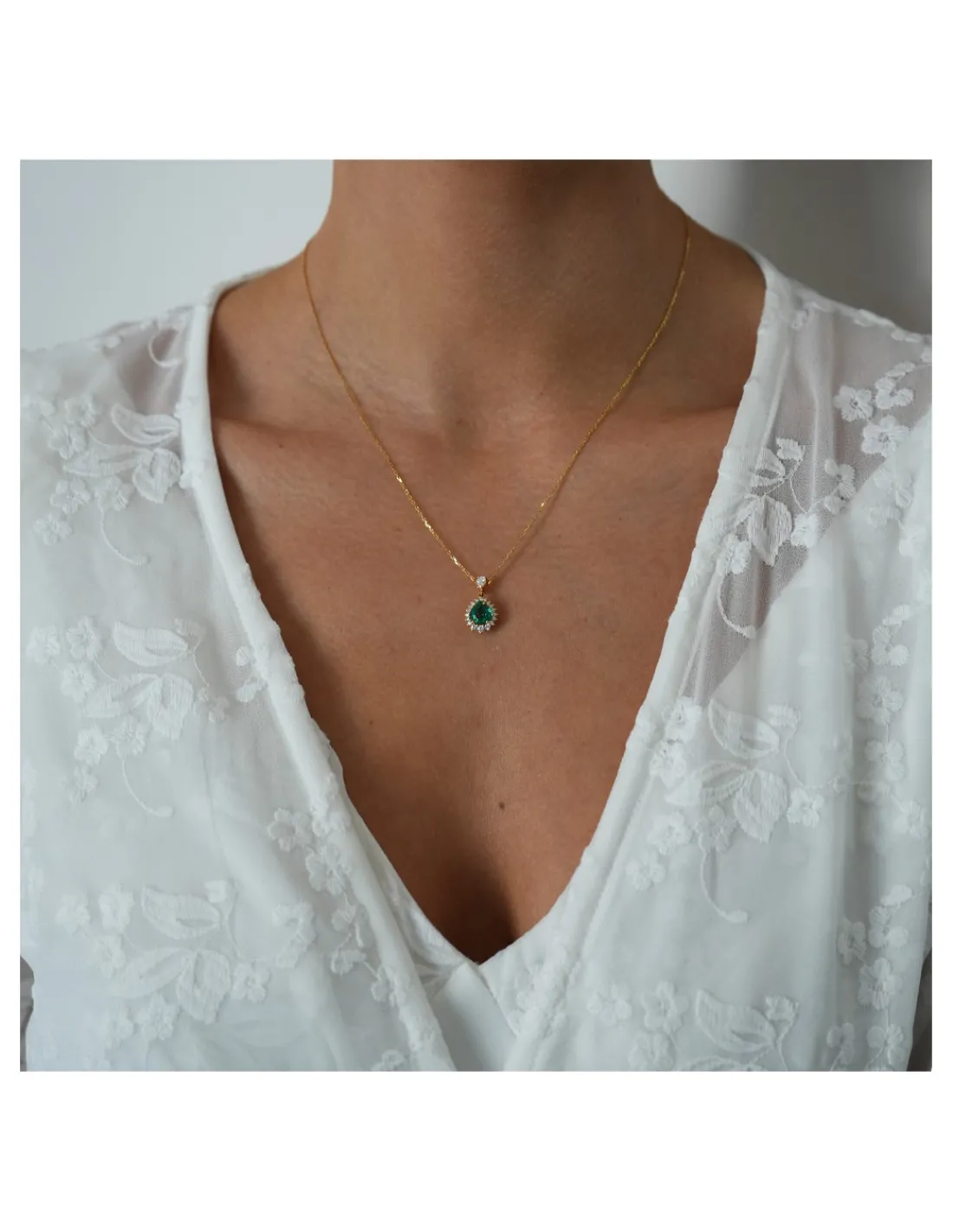 Colgante de oro amarillo 1ª Ley (750 mmas) con un diamante talla pera del que cuelga una esmeralda natural talla pera rodeada de diamantes. Una joya con un toque de elegancia que combina con todos los estilos.