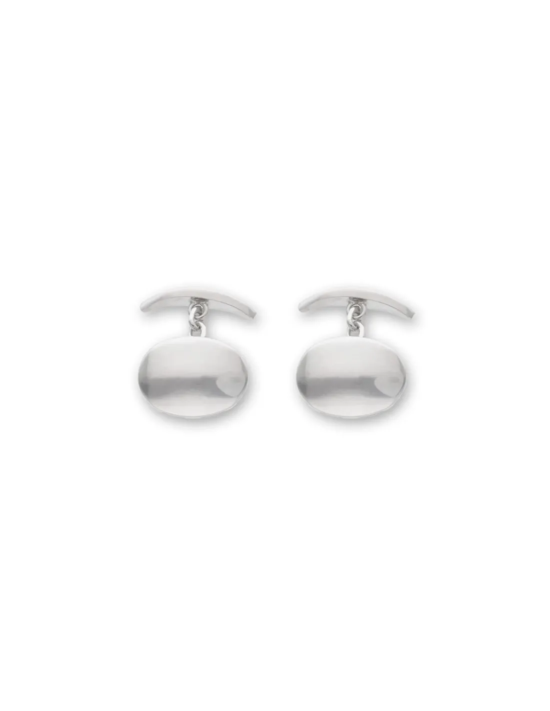 Gemelos de plata de 1ª Ley (925 mmas) con forma ovalada. Cierre de cadena y muletilla. Diámetro aproximado 1,8 cm.