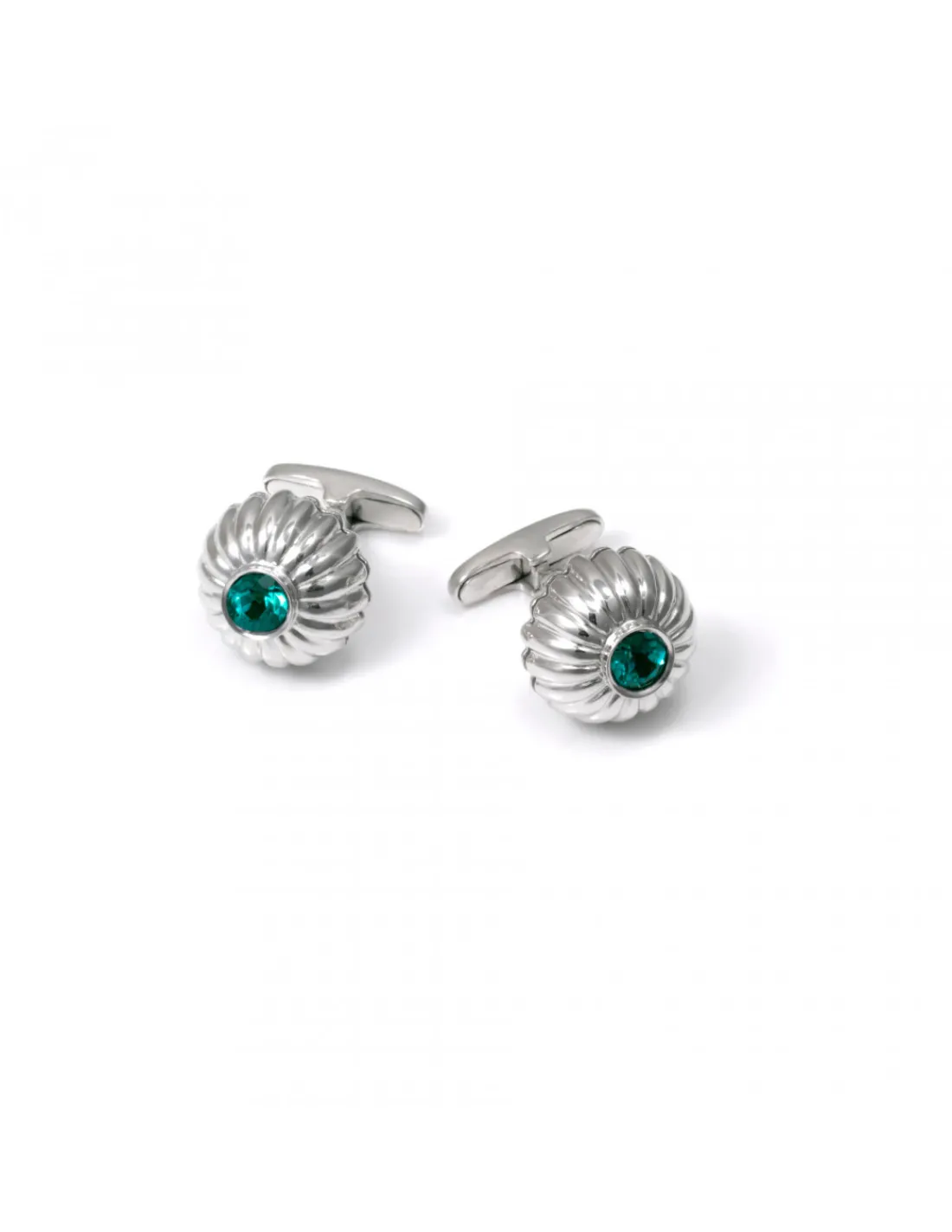 Gemelos de plata 1ª Ley (925 mmas) con media esfera de gallones y piedra verde engastada en el centro. Cierre rígido.
