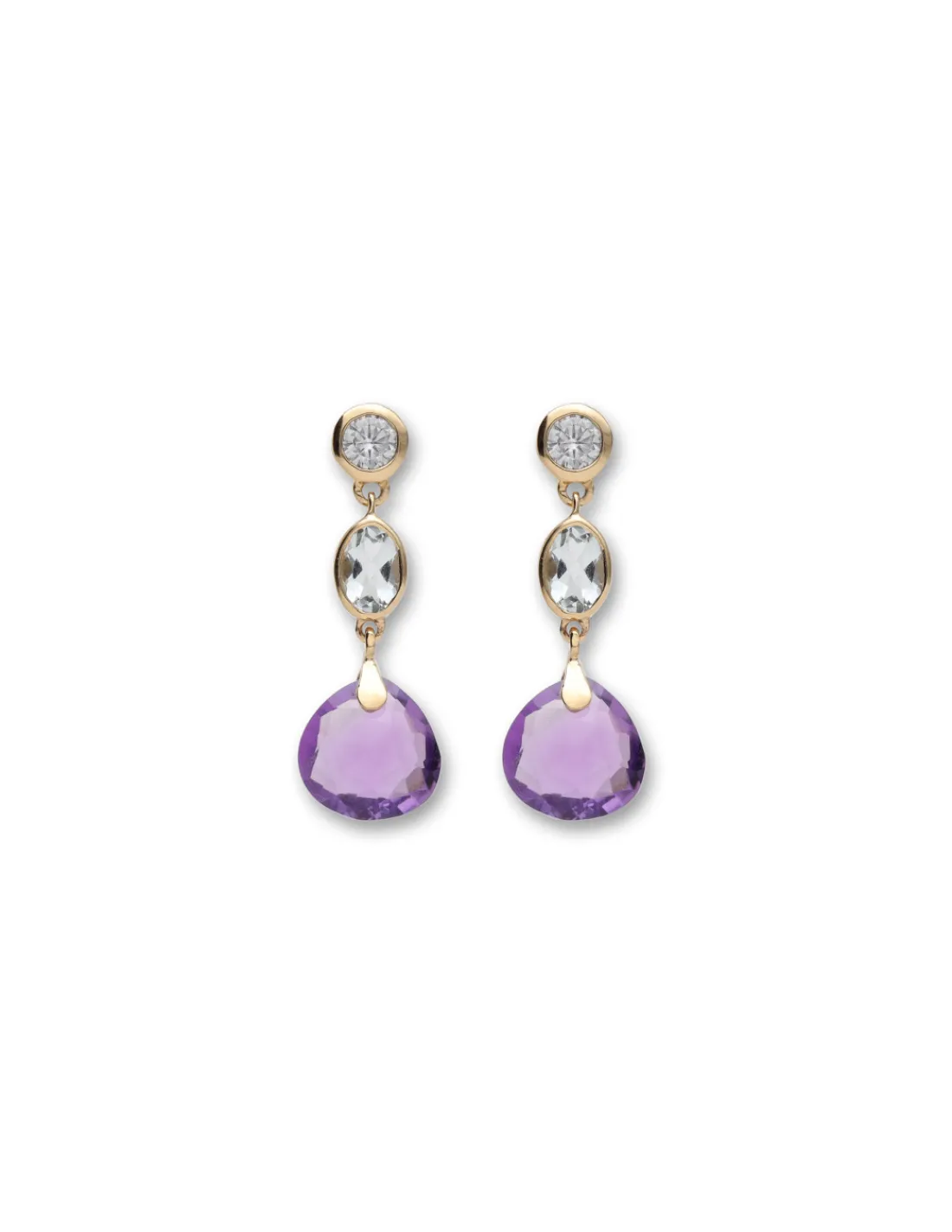 Pendientes de oro amarillo 9 kt (375 mmas) con circonita de la que cuelga un topacio oval y a su vez una amatista talla pera briolette.