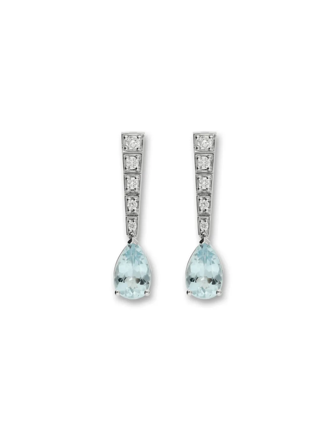 Pendientes de oro blanco 1ª Ley (750 mmas) con diamantes talla brillante y aguamarina talla pera. Un pendiente con luz para novia e invitada que no pasará desapercibido.