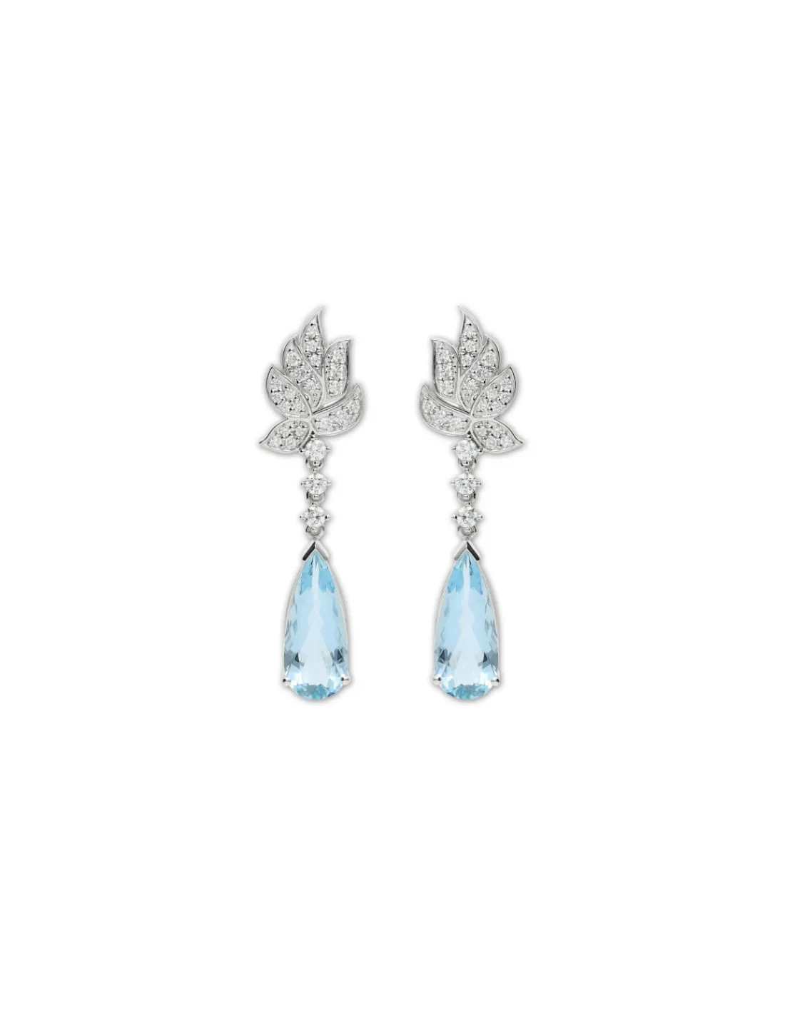Pendientes de oro blanco 1ª Ley (750 mmas) con diseño de hojas con diamantes engastados combinado con una elegante aguamarina natural.