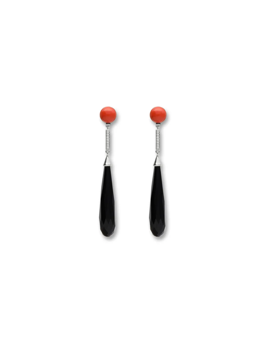 Pendientes de oro blanco 1ª Ley (750 mmas) con un botón de coral del que cuelga una barra rígida engastada con diamantes y a su vez una perilla de ónix. Una joya muy versátil perfecta para invitadas y novias.