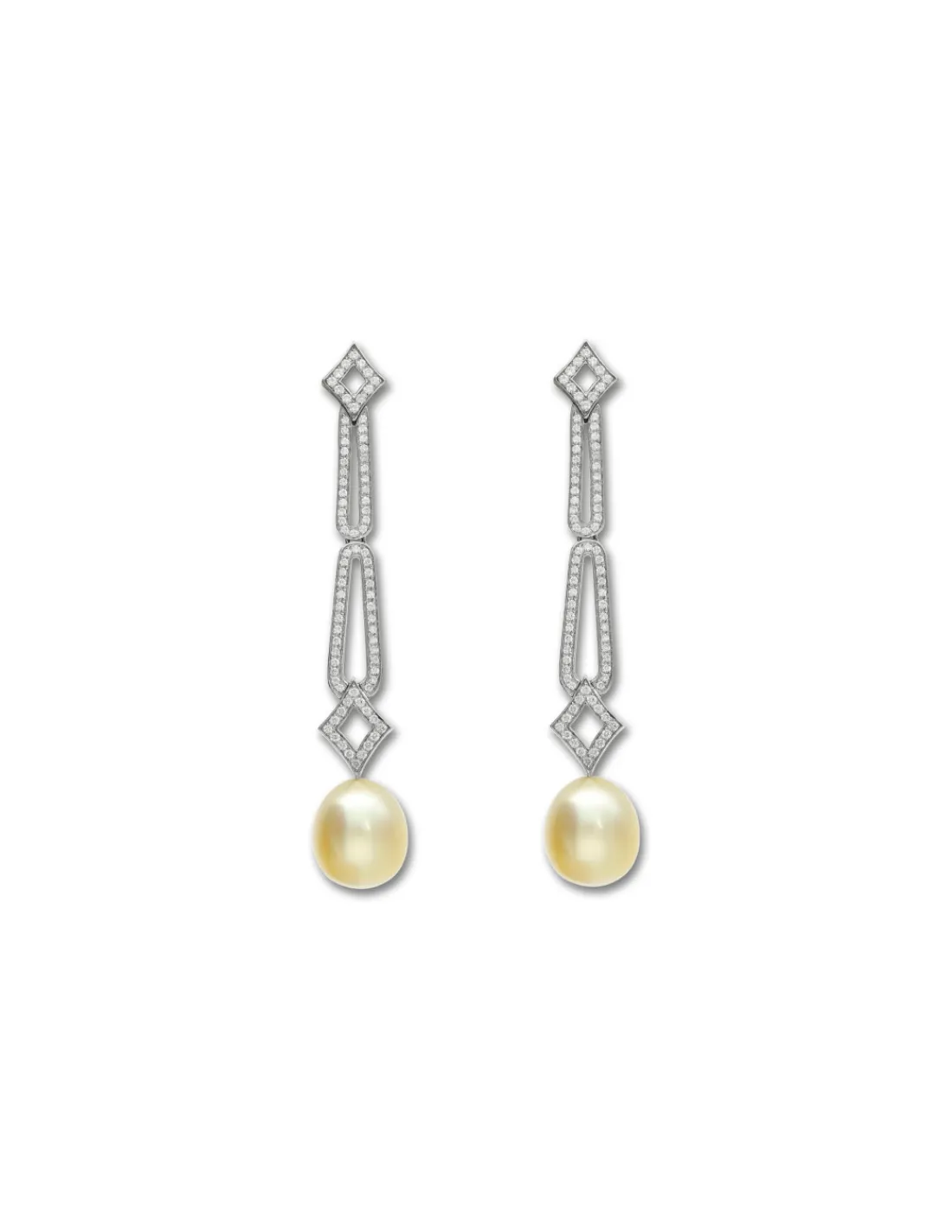 Pendientes de oro blanco 1ª Ley (750 mmas) que combina diamantes talla brillante engastados en grano con perlas australianas. La unión de perlas y diamantes aporta luminosidad al rostro. Cierre de palillo y presión. Largo aproximado 7,8 cm.