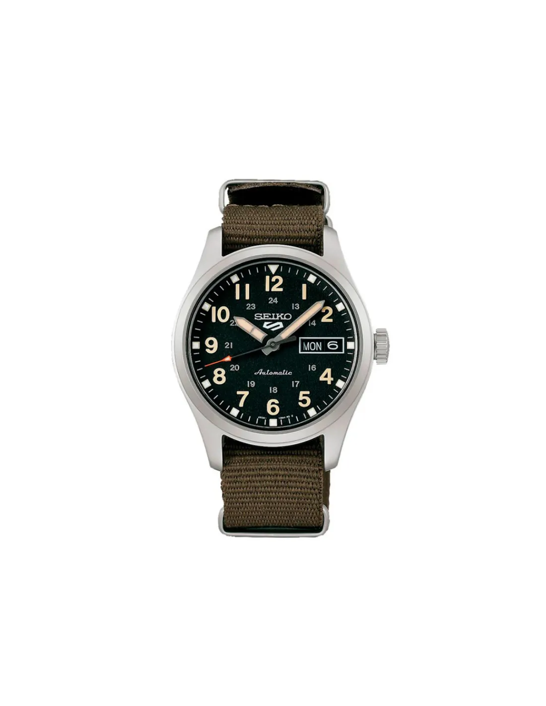 Reloj Seiko 5 Sports Field SRPJ85K1 para hombre con caja de acero inoxidable, esfera negra y correa de nylon verde. Movimiento automático con capacidad de carga manual.