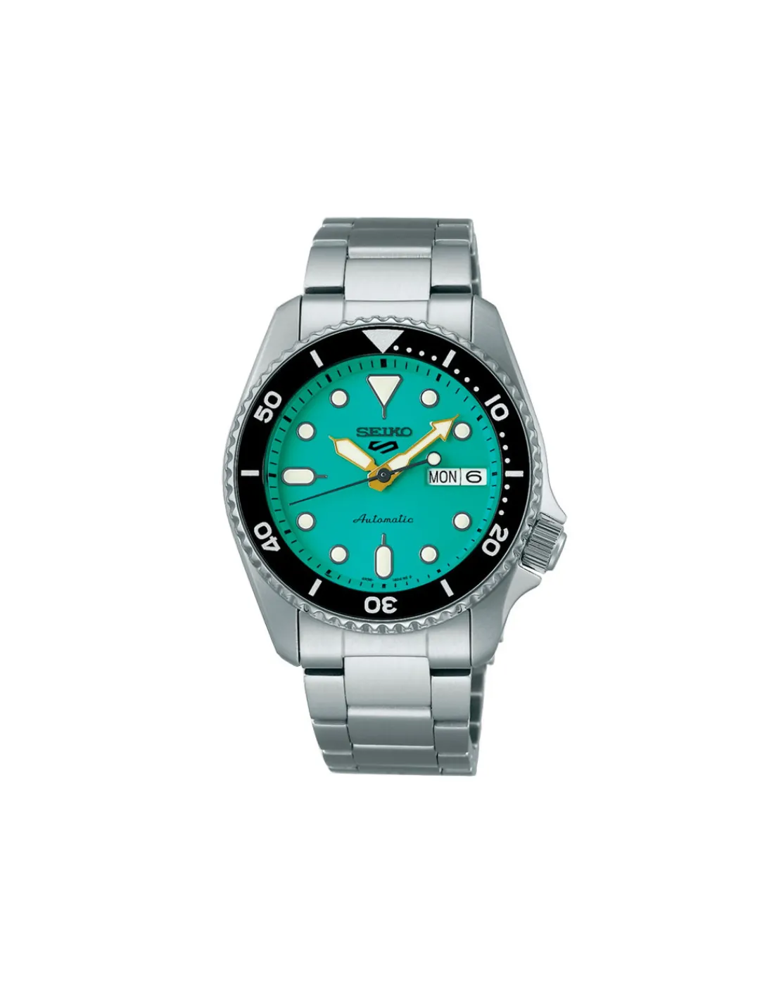 Reloj Seiko 5 Sports SKX Style SRPK33K1 para hombre con caja de acero inoxidable, esfera verde y brazalete. Movimiento automático con capacidad de carga manual.