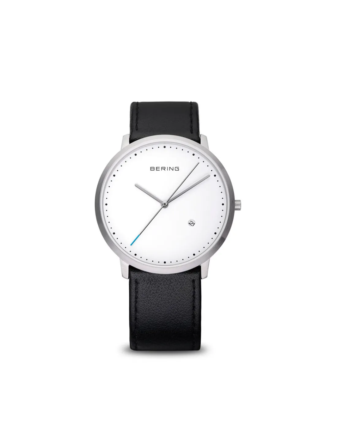Reloj Bering Classic para unisex con caja de acero de 39 mm, esfera blanca y correa de piel de becerro color negro. Un reloj clásico y purista con un estilo perfeccionado que se mezcla con el minimalismo contemporáneo. Movimiento de cuarzo.