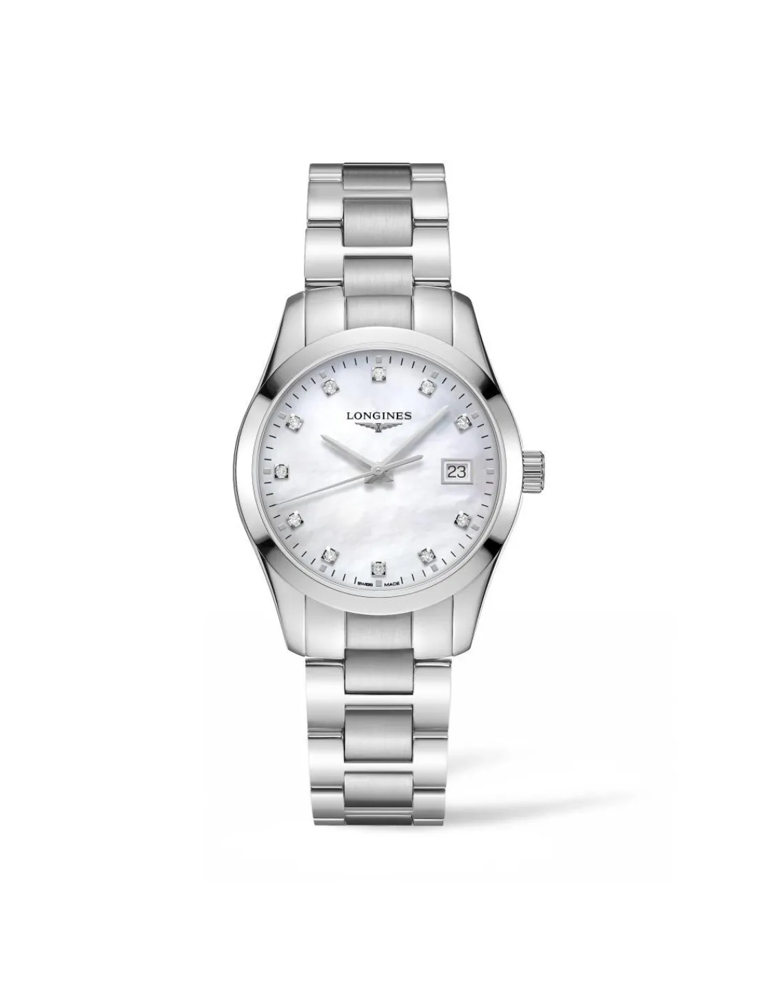 Reloj Longines Conquest Classic para mujer con caja de acero de 34 mm, esfera de madreperla blanca con once diamantes y brazalete de acero. Un reloj lleno de detalles que se mantiene fiel a la elegancia clásica y atemporal que caracteriza a la marca relojera suiza. Movimiento de cuarzo Swiss Made.