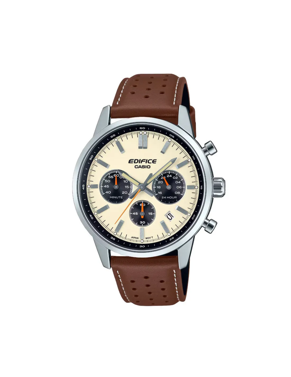 Reloj Casio Edifice con caja de acero inoxidable de 40,5 mm de diámetro, esfera bicolor beige y negro, cristal mineral esférico combinado con correa de piel marrón. Duración aproximada de la batería: 2 años en SR920SW. Movimiento de cuarzo japonés.