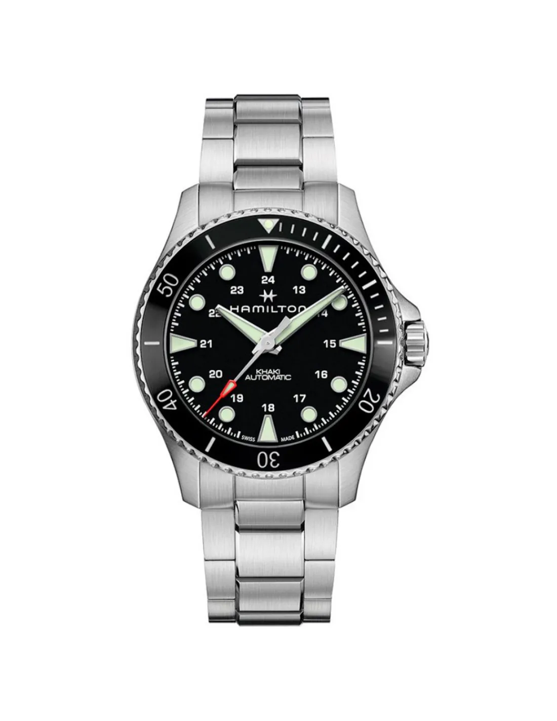 Reloj Hamilton Khaki Navy Scuba para hombre con caja de acero de 43 mm de diámetro, esfera negra con agujas e índices Super-LumiNova, bisel de cerámica con números grabados y cristal de zafiro combinado con brazalete. El lujo se combina con el deporte en este reloj de inspiración acuática diseñado tanto para el hogar como para una cabaña junto al mar o para explorar los océanos. Calibre H-10. Movimiento automático Swiss Made con 80 horas de reserva de marcha aproximadamente.