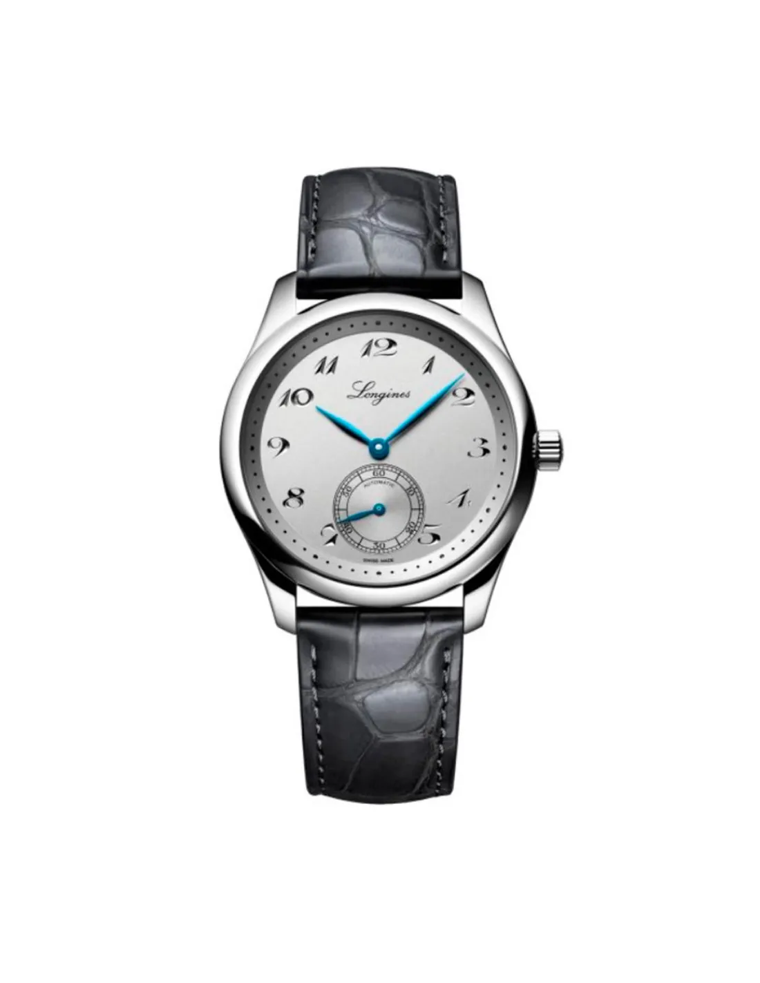 Reloj The Longines Master Collection L2.843.4.73.2 unisex con caja de acero, esfera plateada con números árabes y agujas azules combinado con correa de piel de caimán gris. Movimiento automático Swiss Made con 72 horas de reserva de marcha.