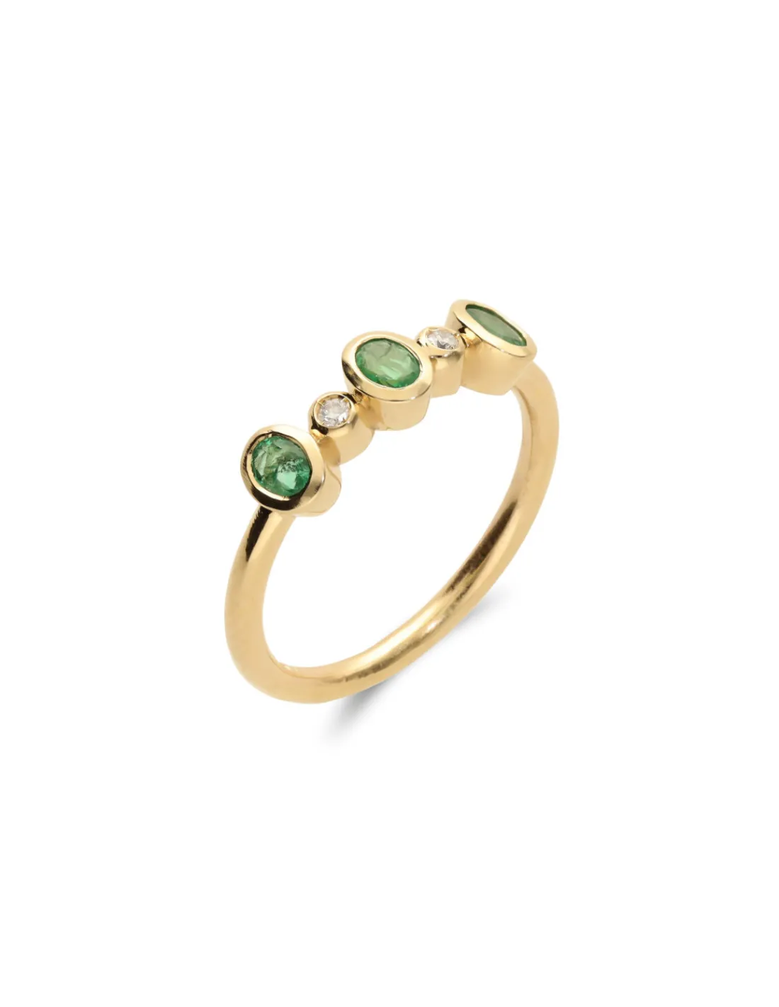 Anillo de oro amarillo 9 kt (375 mmas) con tresillo de esmeraldas ovales engastadas en boquilla acompañadas de diamantes talla brillante. Talla 12.