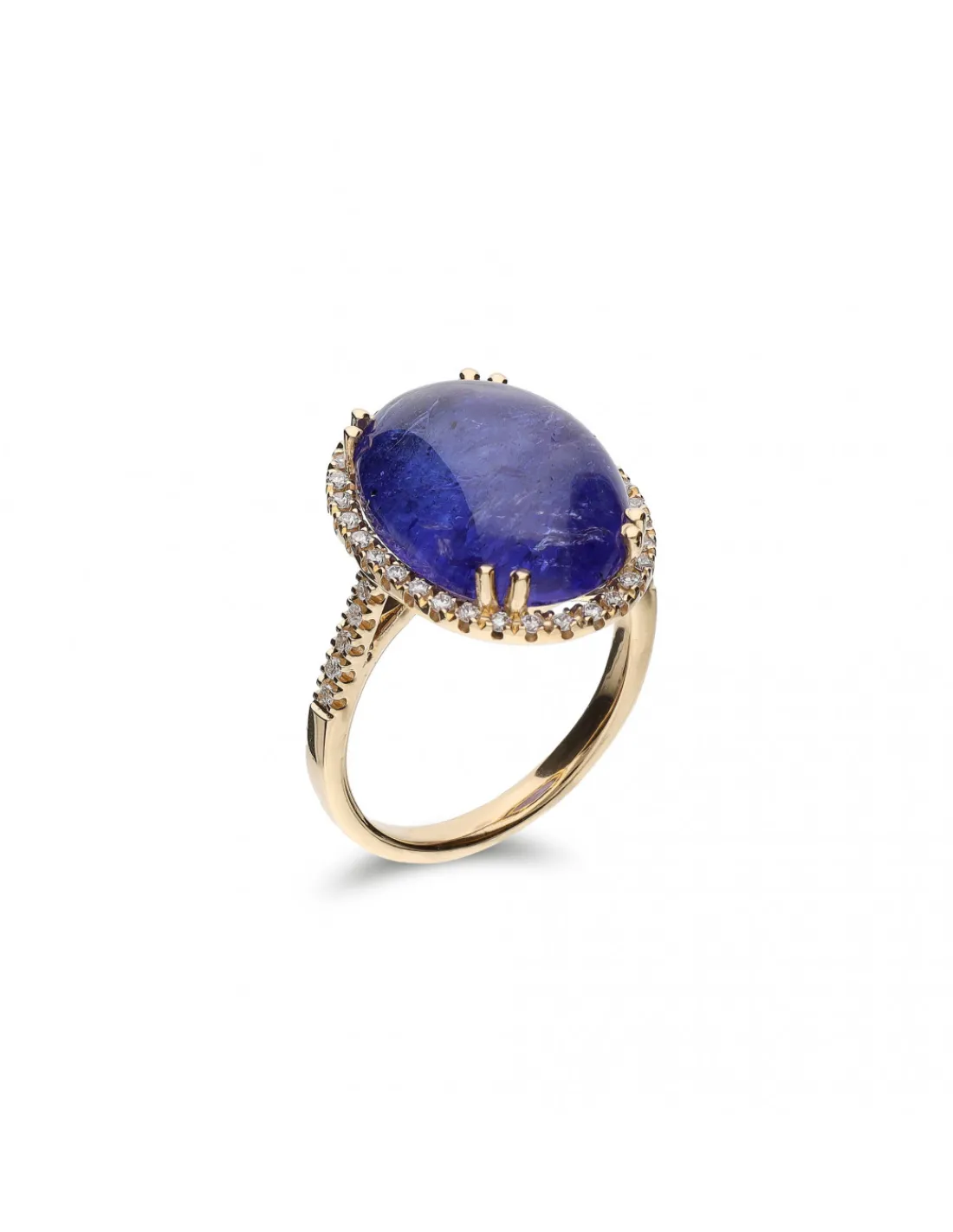 Anillo de oro amarillo 1ª Ley (750 mmas) con tanzanita en el centro rodeada de diamantes.