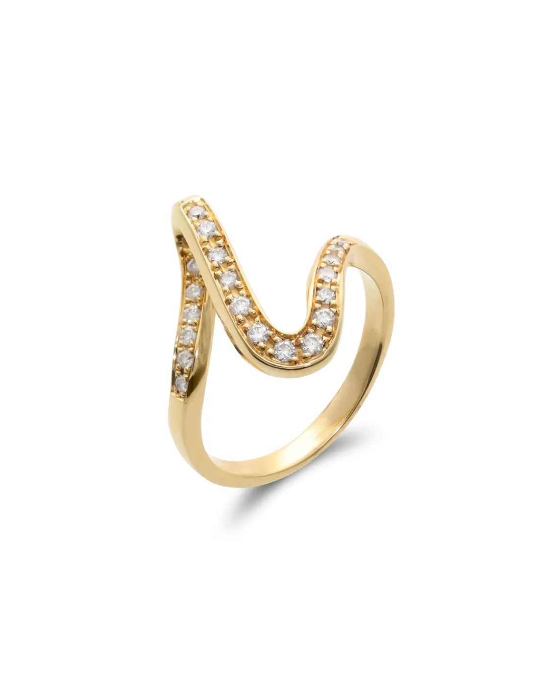 Anillo de oro amarillo 1ª Ley (750 mmas) con diamantes talla brillante. Esta joya presenta un diseño moderno, elegante y llamativo.