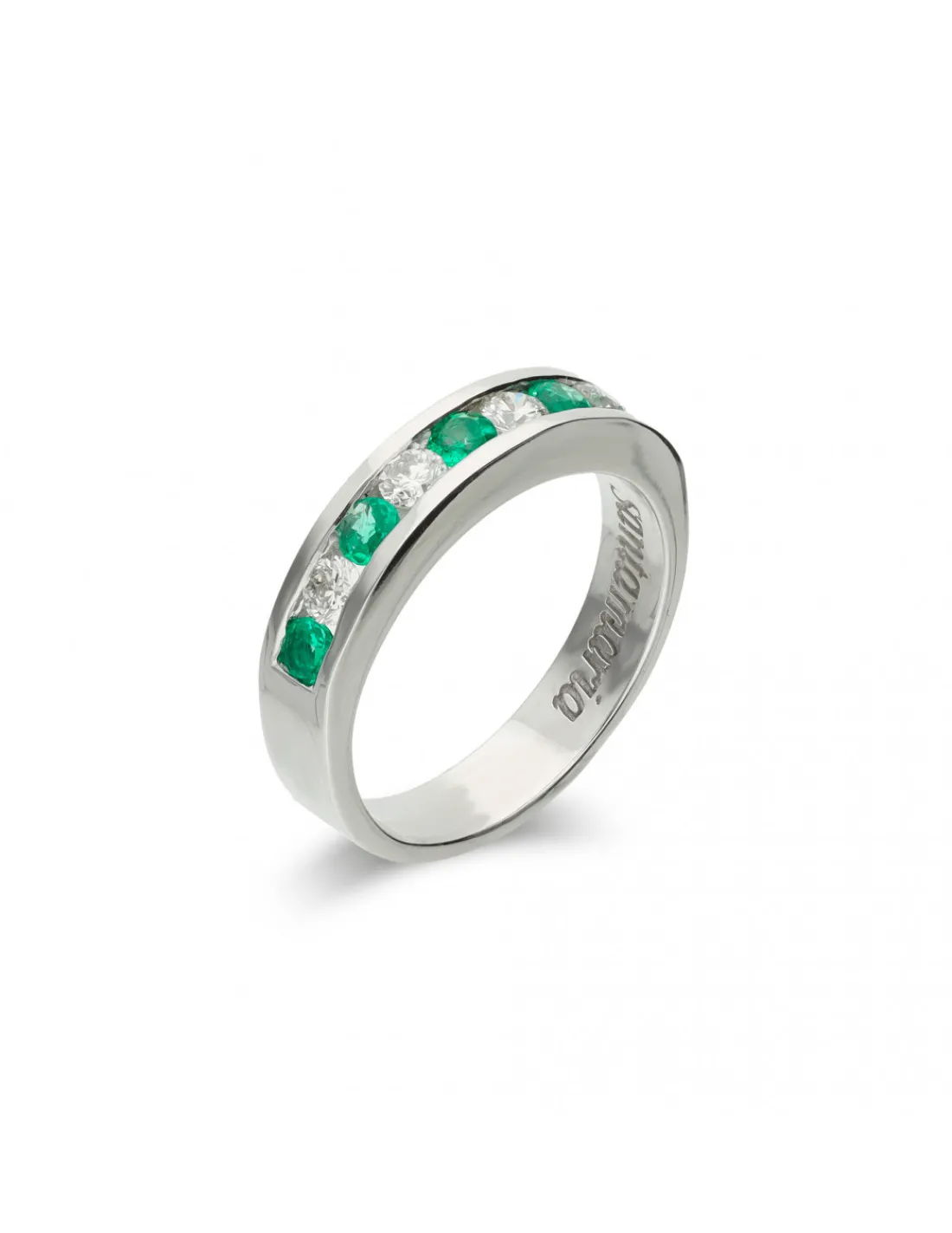 Anillo de oro blanco 1ª Ley (750 mmas) tipo media alianza con diamantes y esmeraldas.