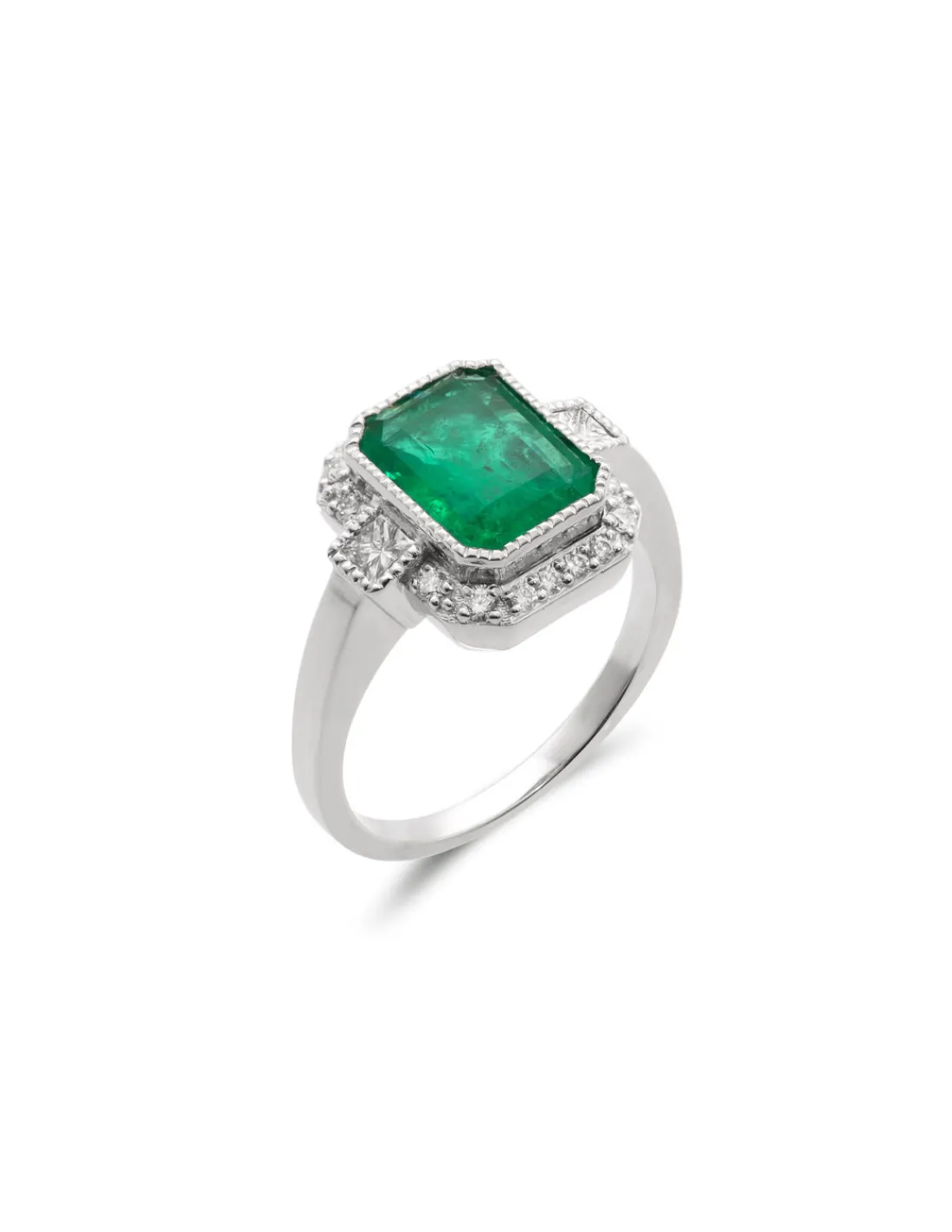 Anillo de oro blanco 1ª Ley (750 mmas) con una esmeralda natural en el centro acompañada de diamantes talla princesa y talla brillante. Un distinguido anillo en el que la fusión del verde intenso de la esmeralda junto a los diamantes resulta deslumbrante.