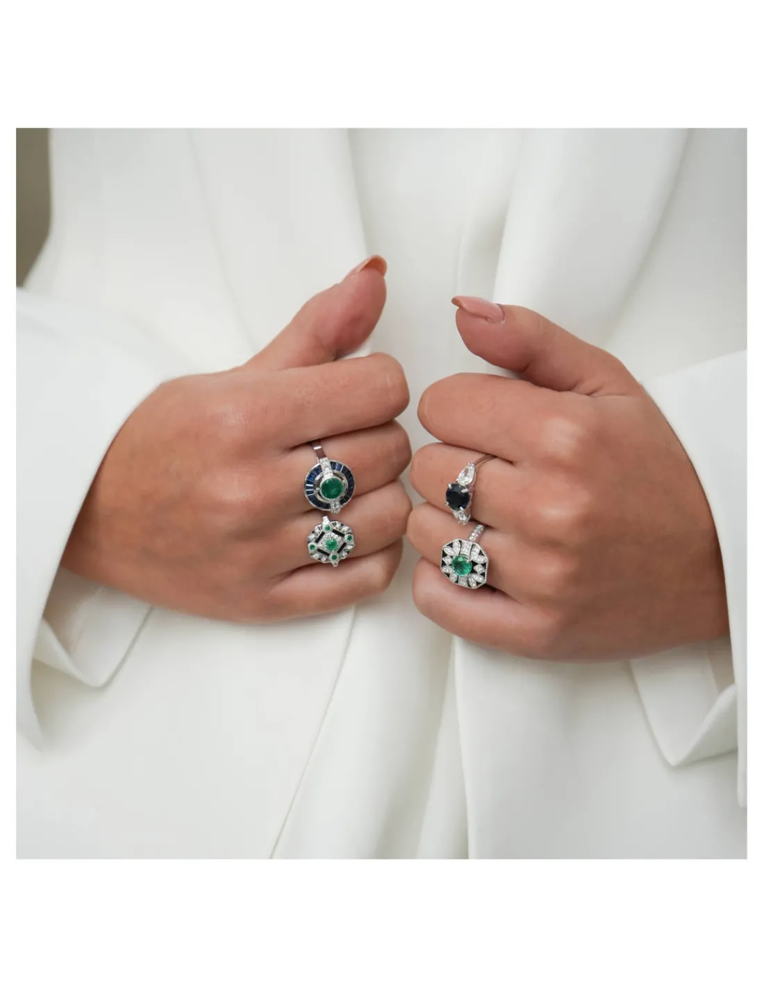 Anillo de oro blanco 1ª Ley (750 mmas) estilo vintage con esmeraldas y diamantes naturales combinados con esmalte negro. Una joya exclusiva con un diseño antiguo.