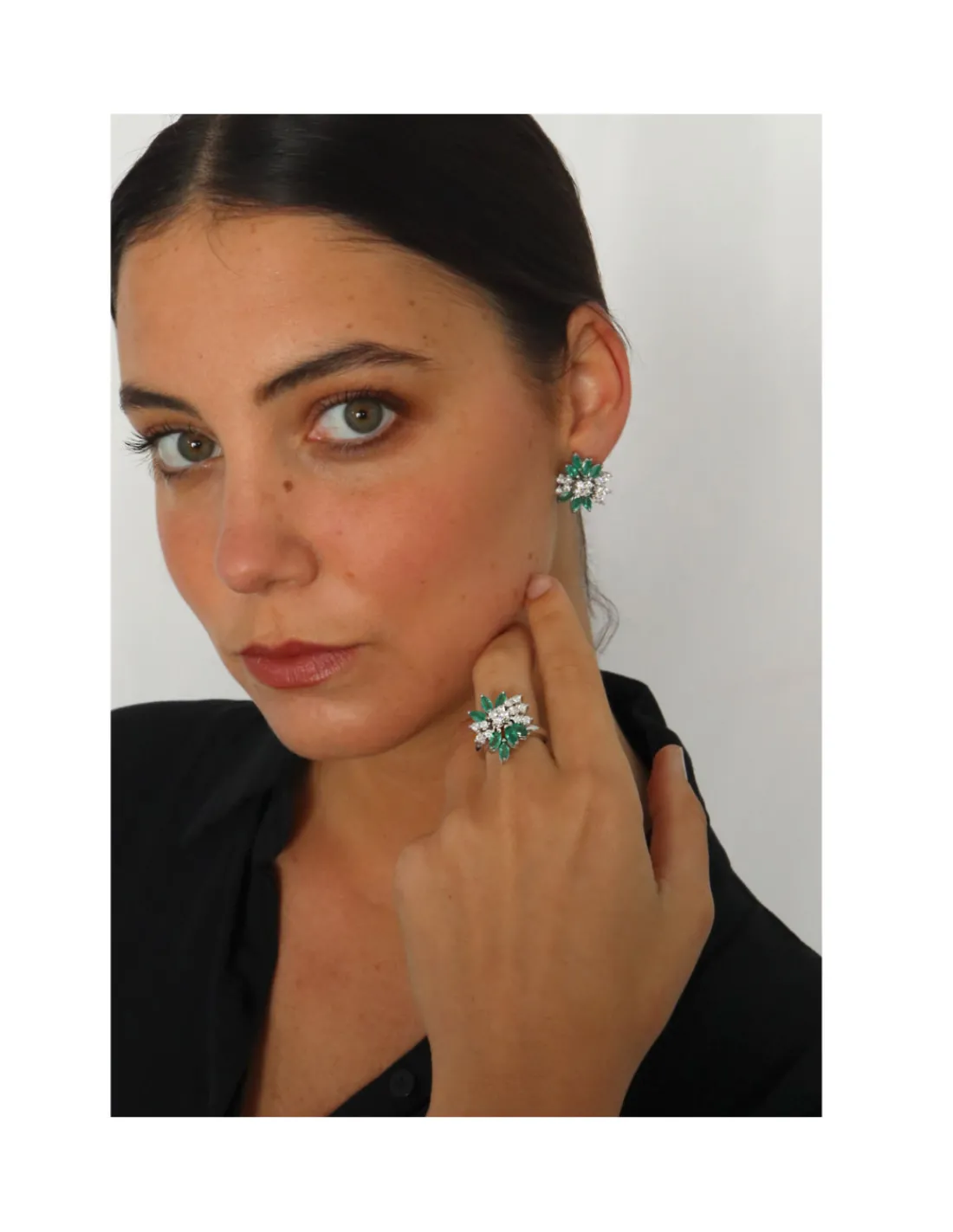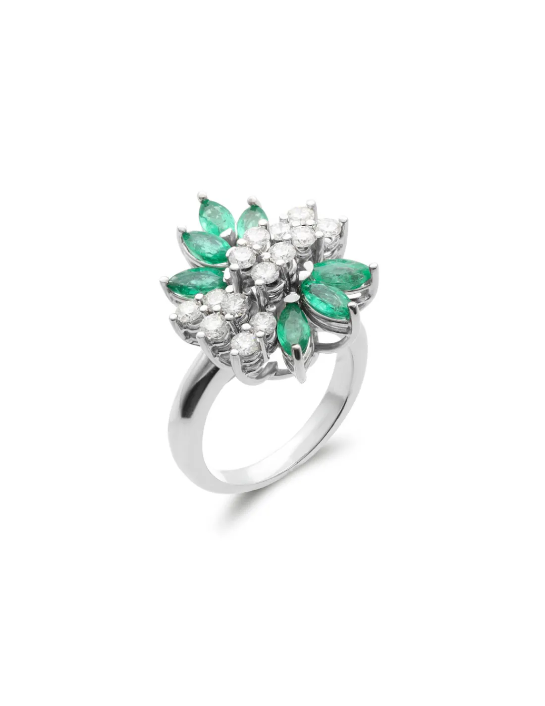 Anillo de oro blanco 1ª Ley (750 mmas) con luminosos diamantes combinados con esmeraldas naturales que evocan la forma de una delicada dalia. Una joya exclusiva para las mejores ocasiones.
