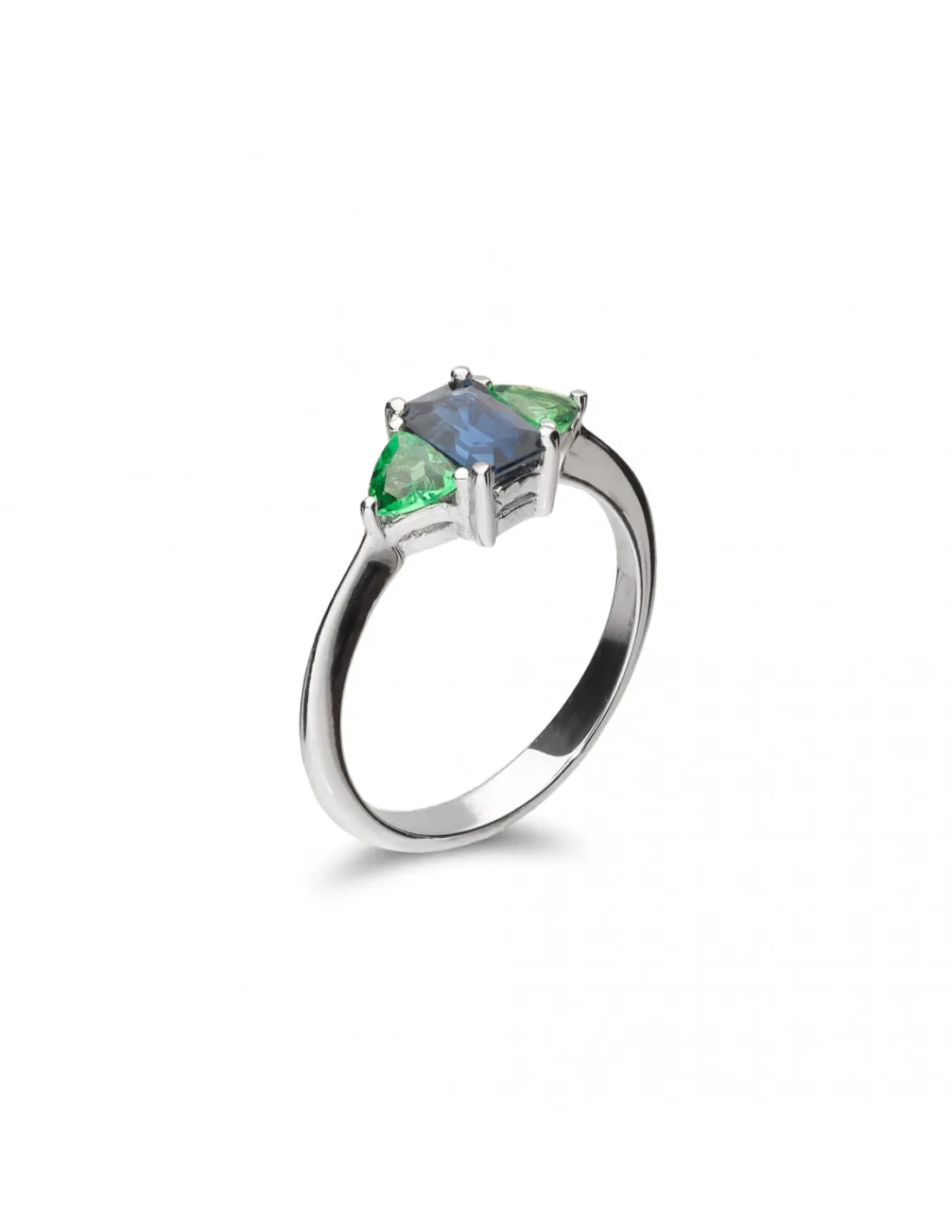 Anillo de oro blanco 1ª Ley (750 mmas) con un zafiro natural central talla esmeralda y una tsavorita talla trillion a cada lado. Un anillo que destaca por la combinación de color y la talla de sus piedras. Talla 13.