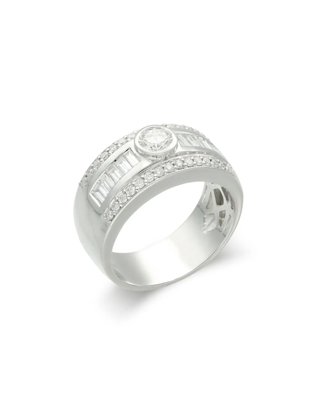 Anillo de oro blanco 1ª Ley (750 mmas) con aro ancho y diamante talla brillante como protagonista en el centro acompañado de diamantes talla baguette y brillante. Mucho más que una joya, esta pieza es una inversión de orfebrería tradicional y elegancia atemporal que nunca pasará de moda.