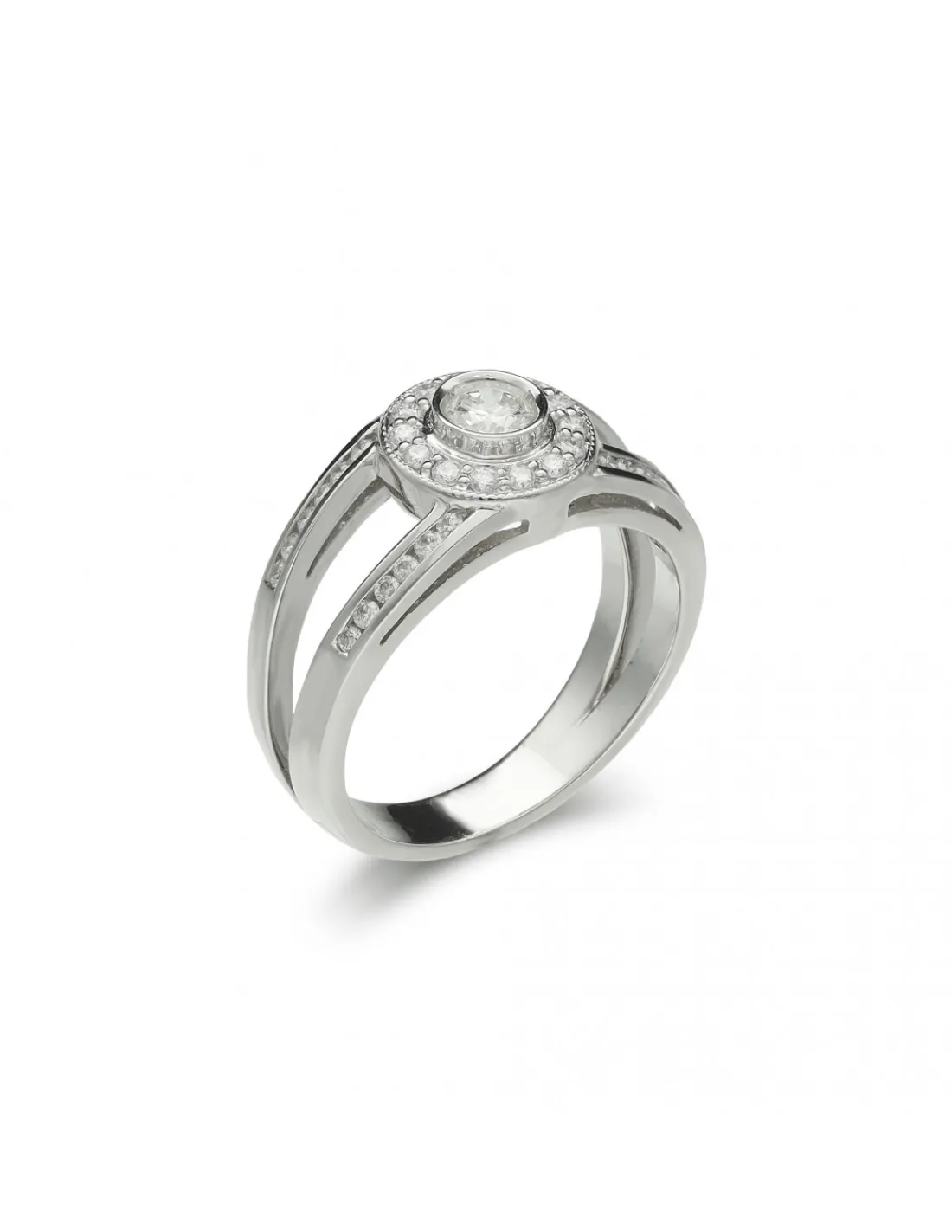 Anillo de oro blanco 1ª Ley (750 mmas) con doble aro y diamantes talla brillante engastados en carril en cada uno de ellos. Un diseño que une los aros a través de una roseta de diamantes naturales talla brillante. Una joya muy versátil perfecta para compromiso o cualquier ocasión. Talla 13.