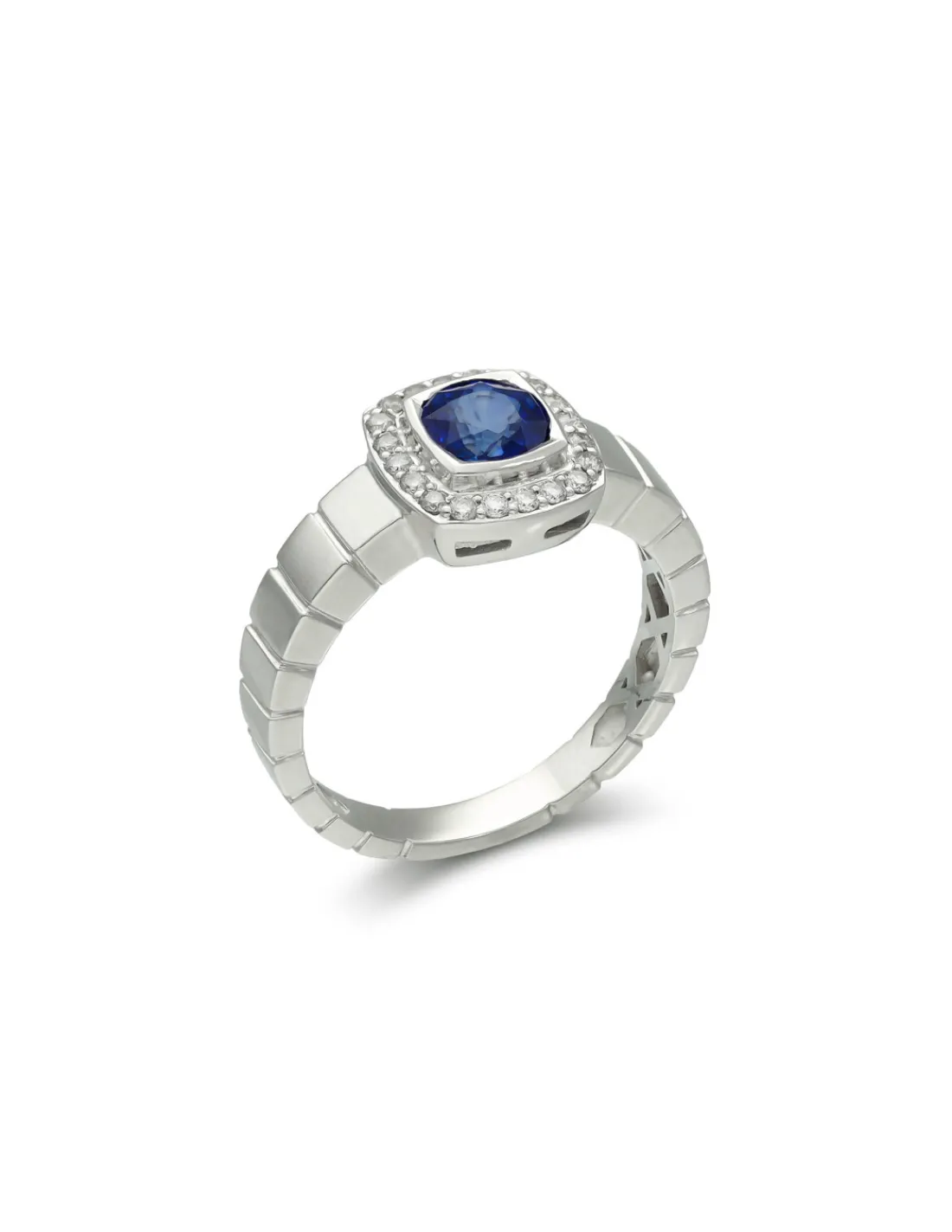 Anillo de oro blanco 1ª Ley (750 mmas) con un zafiro en el centro rodeado de diamantes talla brillante. Una joya que destaca por sus elegantes y deslumbrantes matices azules.