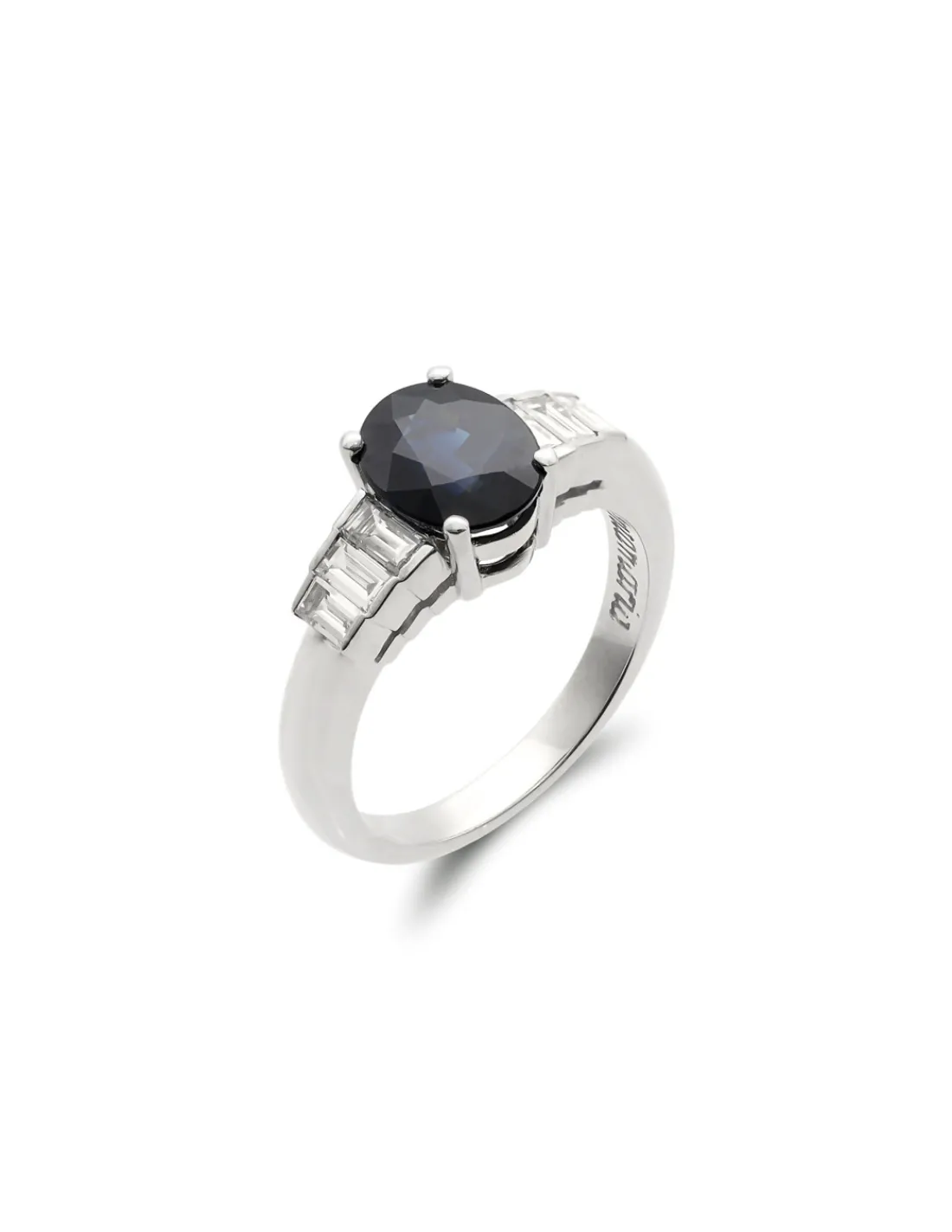 Anillo de oro blanco 1ª Ley (750 mmas) con un zafiro natural talla oval engastado en cuatro garras acompañado de diamantes talla baguette en los laterales. Talla 13.