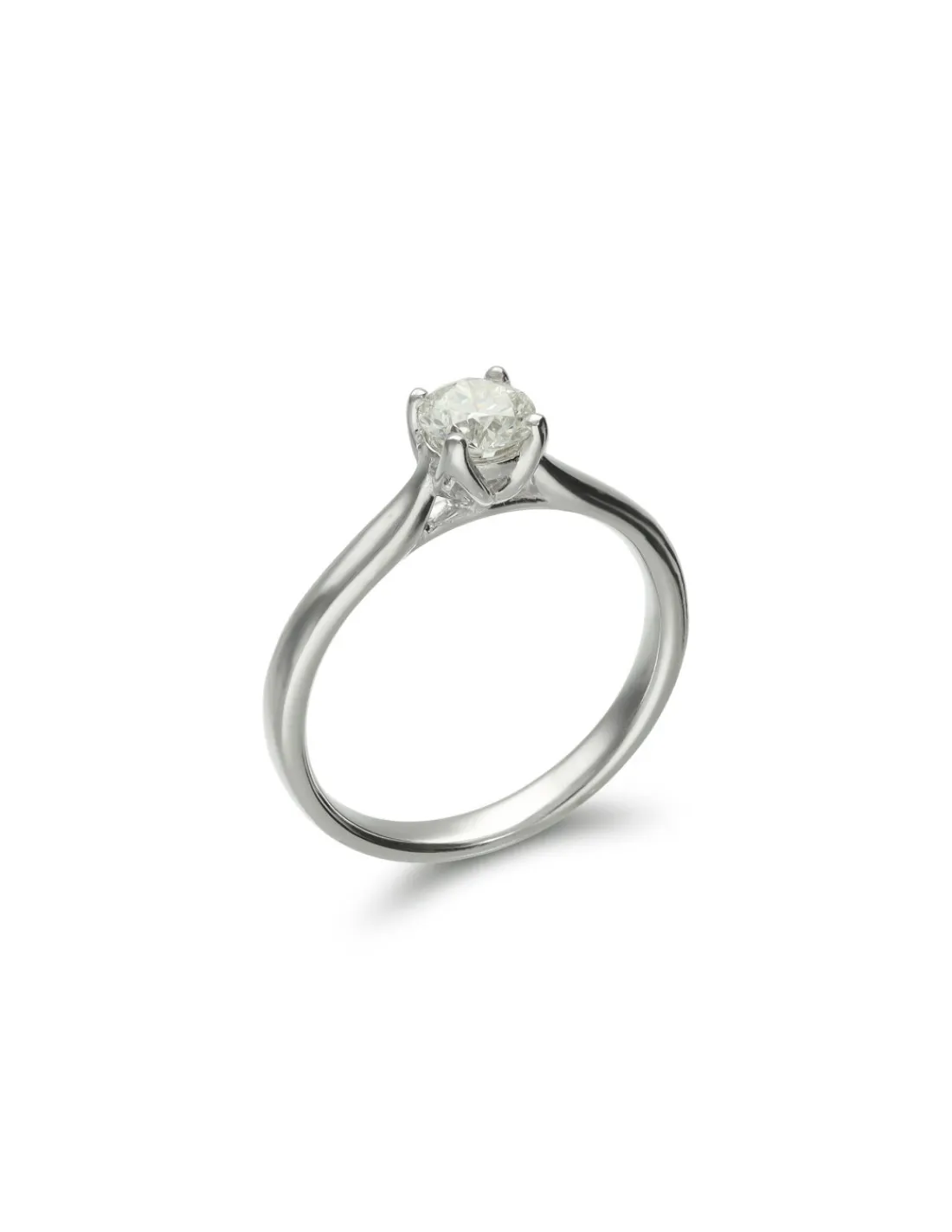 Anillo-Solitario de oro blanco 1ª Ley (750 mmas) con diamante central y engaste clásico de cuatro garras. Un anillo de compromiso discreto y elegante.