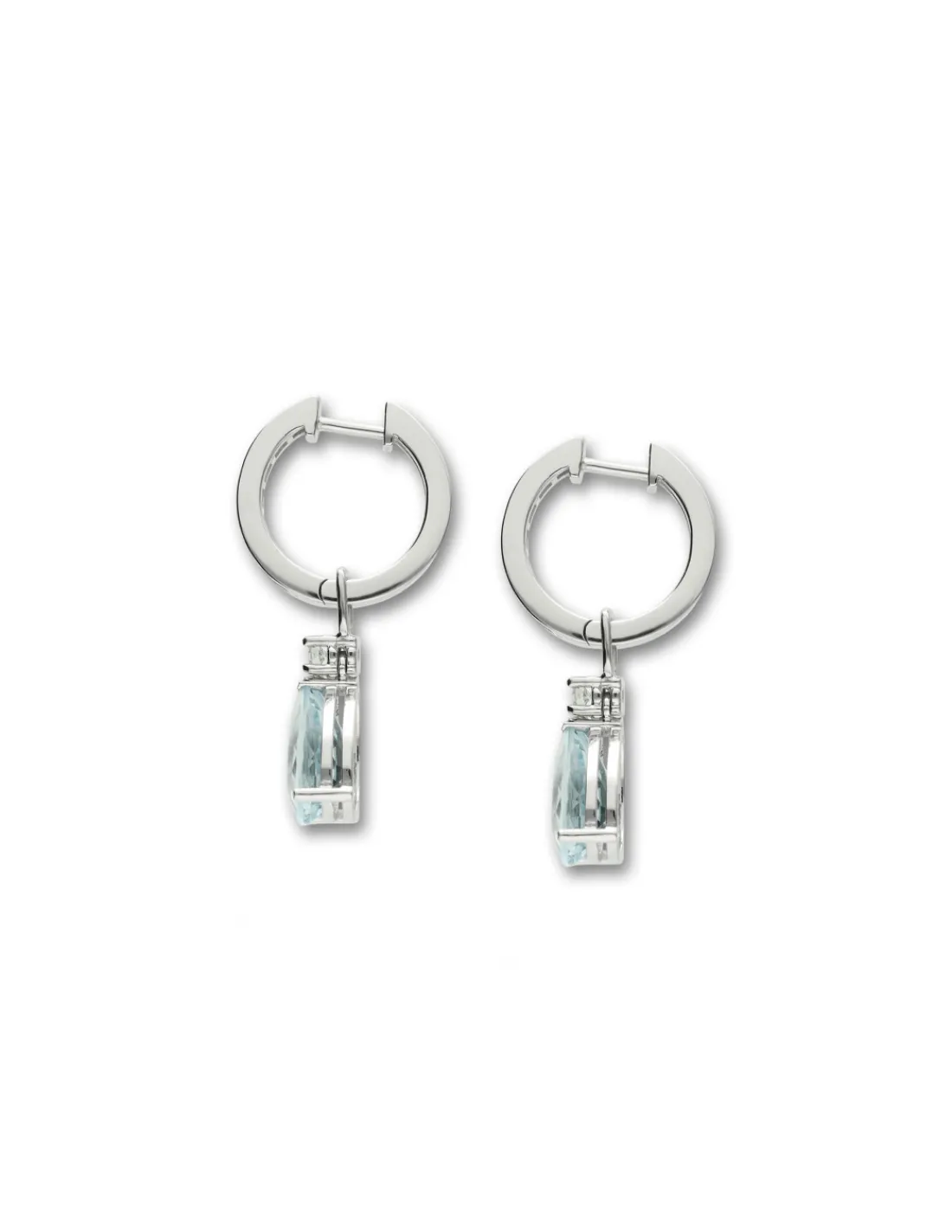 Argollas de oro blanco 1ª Ley (750 mmas) con diamantes talla brillante engastados en carril combinadas con un diamante engastado en cuatro garras del que cuelga una aguamarina talla pera. Largo aproximado 3 cm.