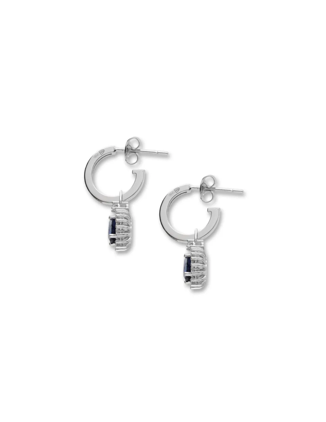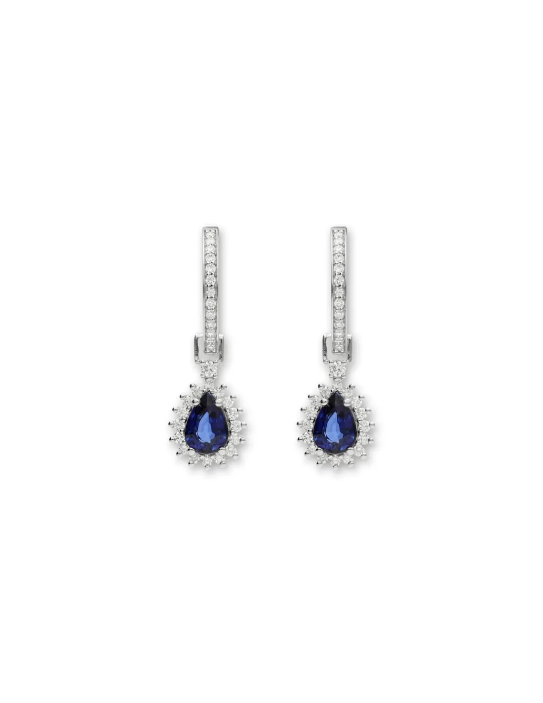 Argollas de oro blanco 1ª Ley (750 mmas) engastadas con diamantes talla brillante de la que cuelga un zafiro talla pera rodeado de una orla de diamantes.