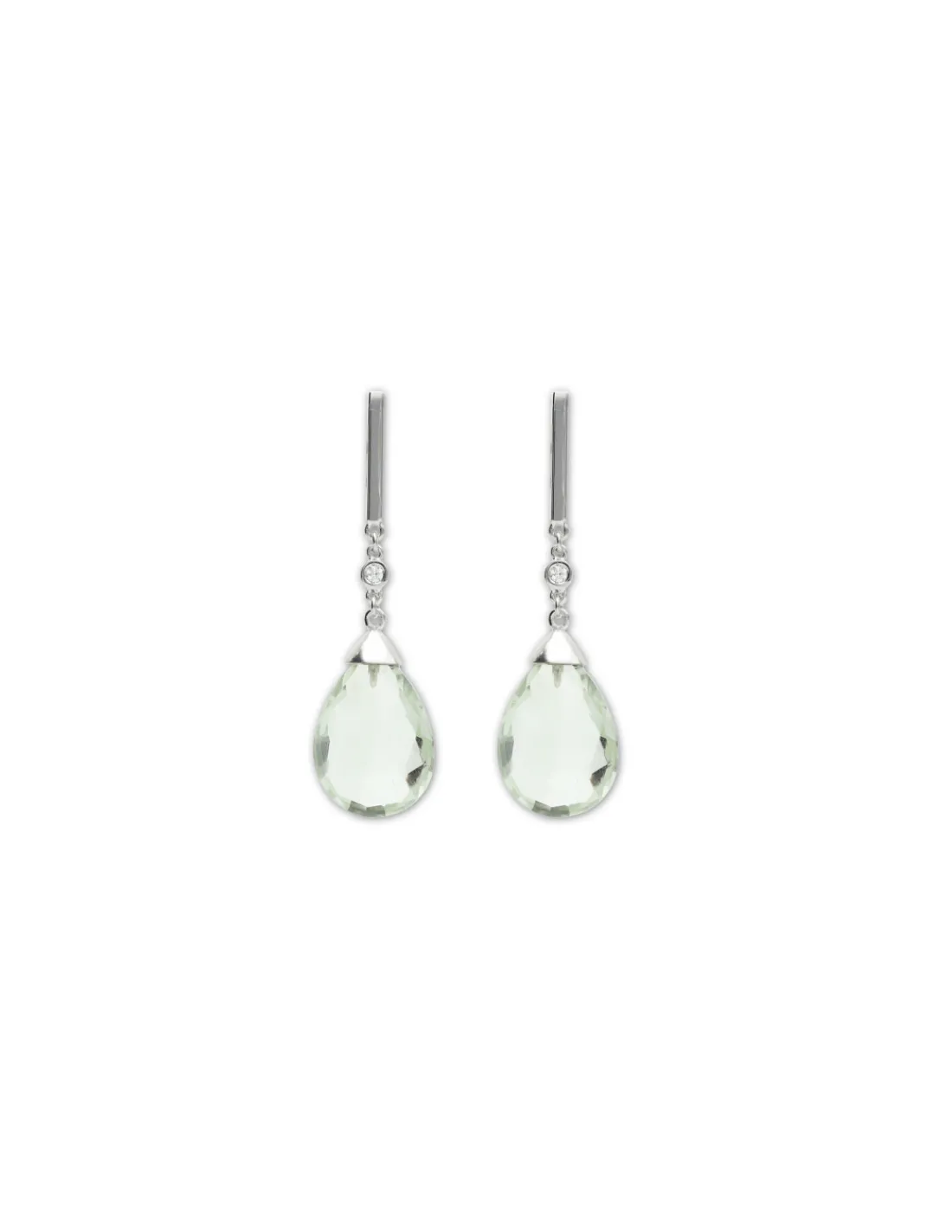 Pendientes de oro blanco 9 kt (375 mmas) con diamante talla brillante y amatista verde talla pera briolette. Cierre de palillo y presión. Largo aproximado 4,2 cm.