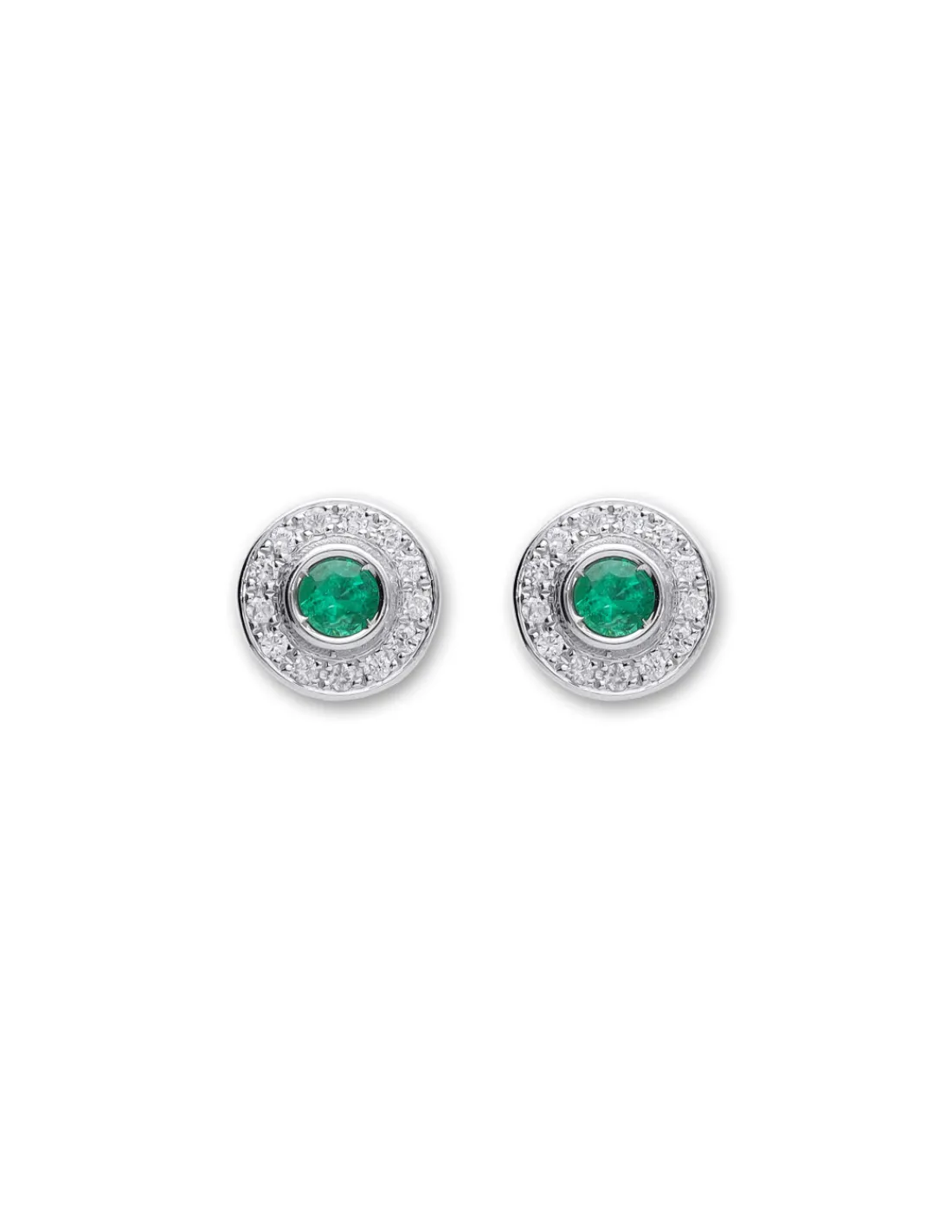 Pendientes de oro blanco 9 kt (375 mmas) con una esmeralda redonda engastada en boquilla rodeada de una orla de diamantes talla brillante engastados en grano. Cierre de palillo y presión. Diámetro aproximado 8 mm.