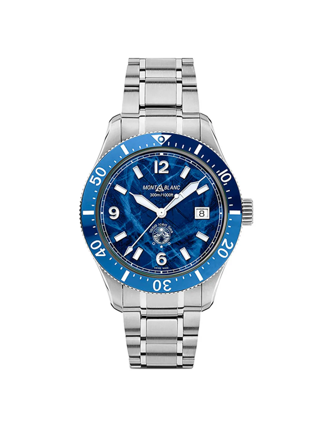 Reloj Montblanc 1858 Iced Sea Automatic Date para hombre con caja de 41 mm, brazalete de acero y esfera azul con motivo de glaciar que se inspira en el Mer de Glace (Mar de Hielo). Diseño de buceo deportivo con bisel de cerámica bicolor y tapa trasera grabada. Movimiento automático Swiss Made.
