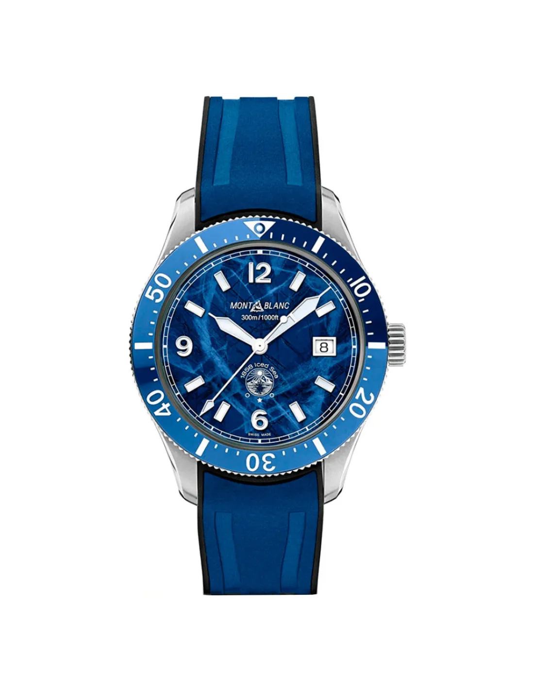 Reloj Montblanc 1858 Iced Sea Automatic Date para hombre con caja de acero de 41 mm y correa de caucho azul combinado con esfera azul con motivo de glaciar que se inspira en el Mer de Glace (Mar de Hielo). Diseño de buceo deportivo que cumple con la norma ISO 6425 para los relojes de buceo. Movimiento automático Swiss Made.