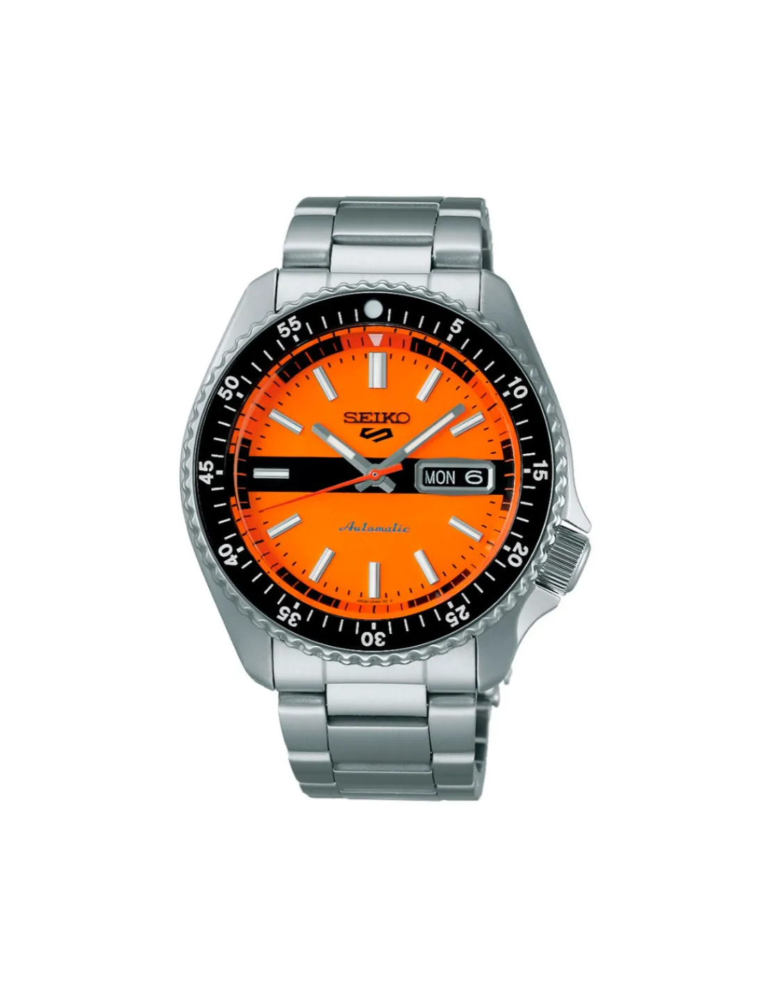 Reloj Seiko 5 Sports 55 Aniversario Edición Especial para hombre con caja de acero de 42,5 mm de diámetro, bisel giratorio unidireccional, esfera naranja con Lumibrite en agujas, índices y bisel, cristal de Hardlex curvado y brazalete de acero. Calibre 4R36. Movimiento automático con 41 horas de reserva de marcha aproximadamente.