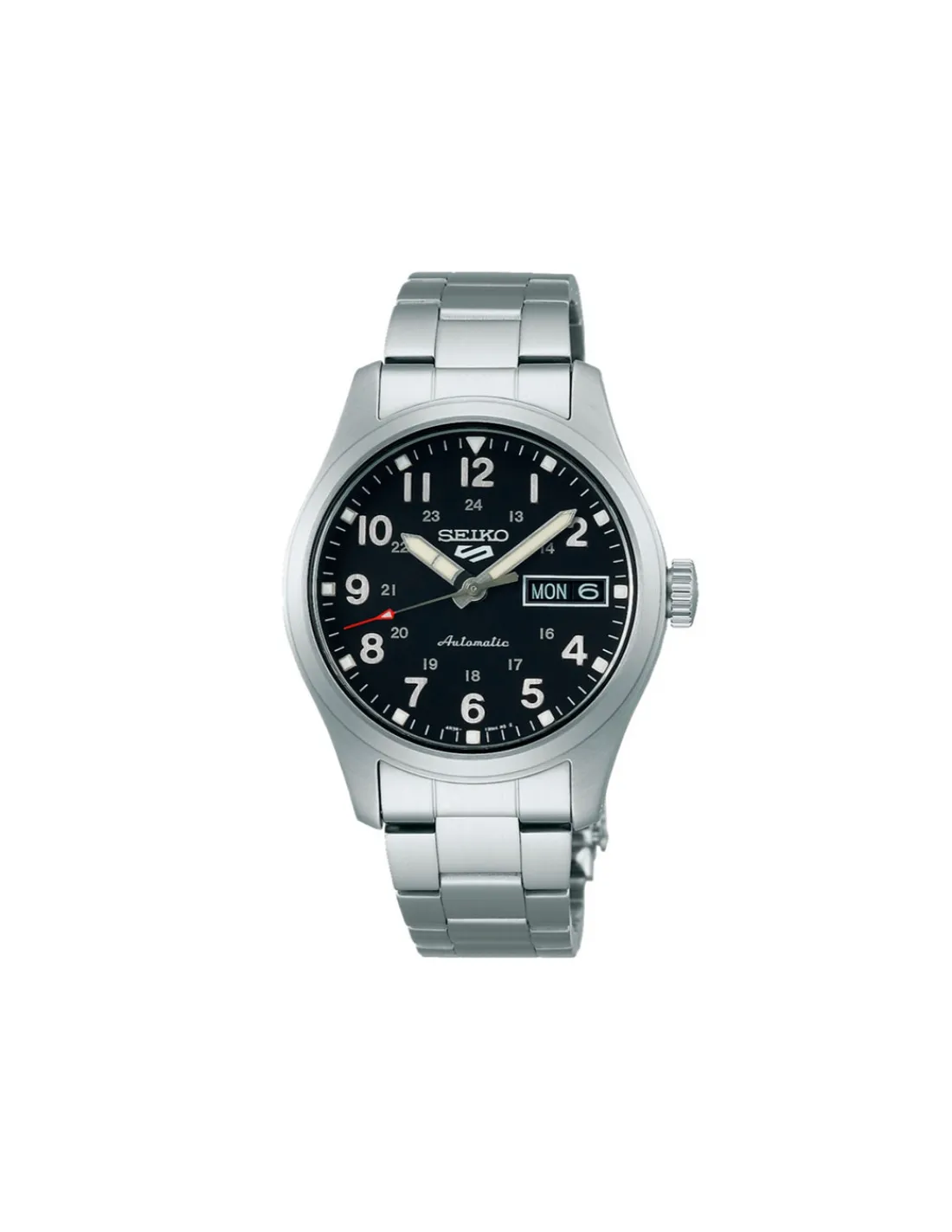 Reloj Seiko 5 Sports Field Sports Style SRPJ81K1 con caja de acero inoxidable, esfera negra y brazalete. Movimiento automático con capacidad de carga manual.