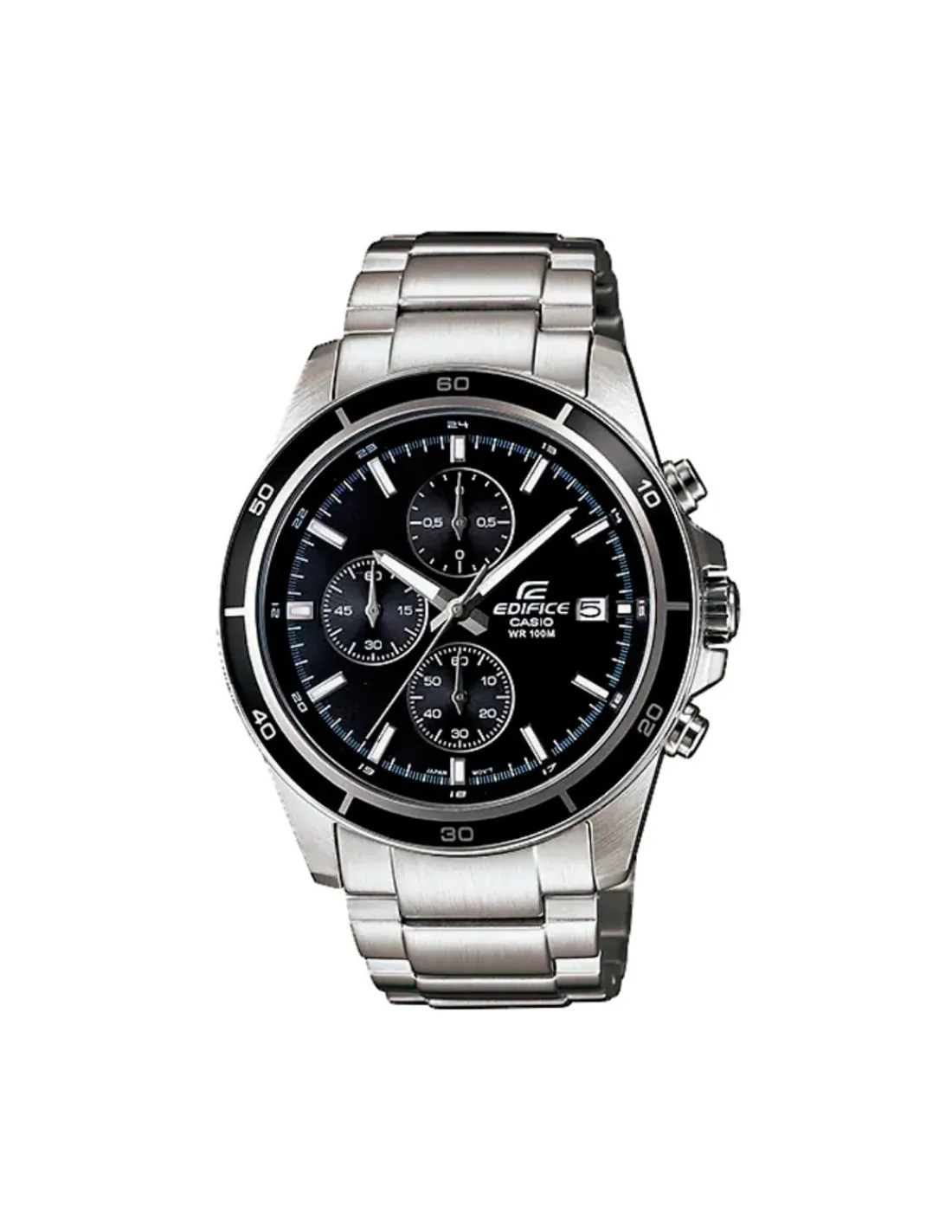 Reloj Casio Edifice para hombre con caja de acero inoxidable de 43,8 mm de diámetro, esfera negra con 3 diales (cronómetro 1/10 segundos, minutos de cronómetro y segundos de cronómetro) y cristal mineral combinado con brazalete de acero. Movimiento de cuarzo japonés.