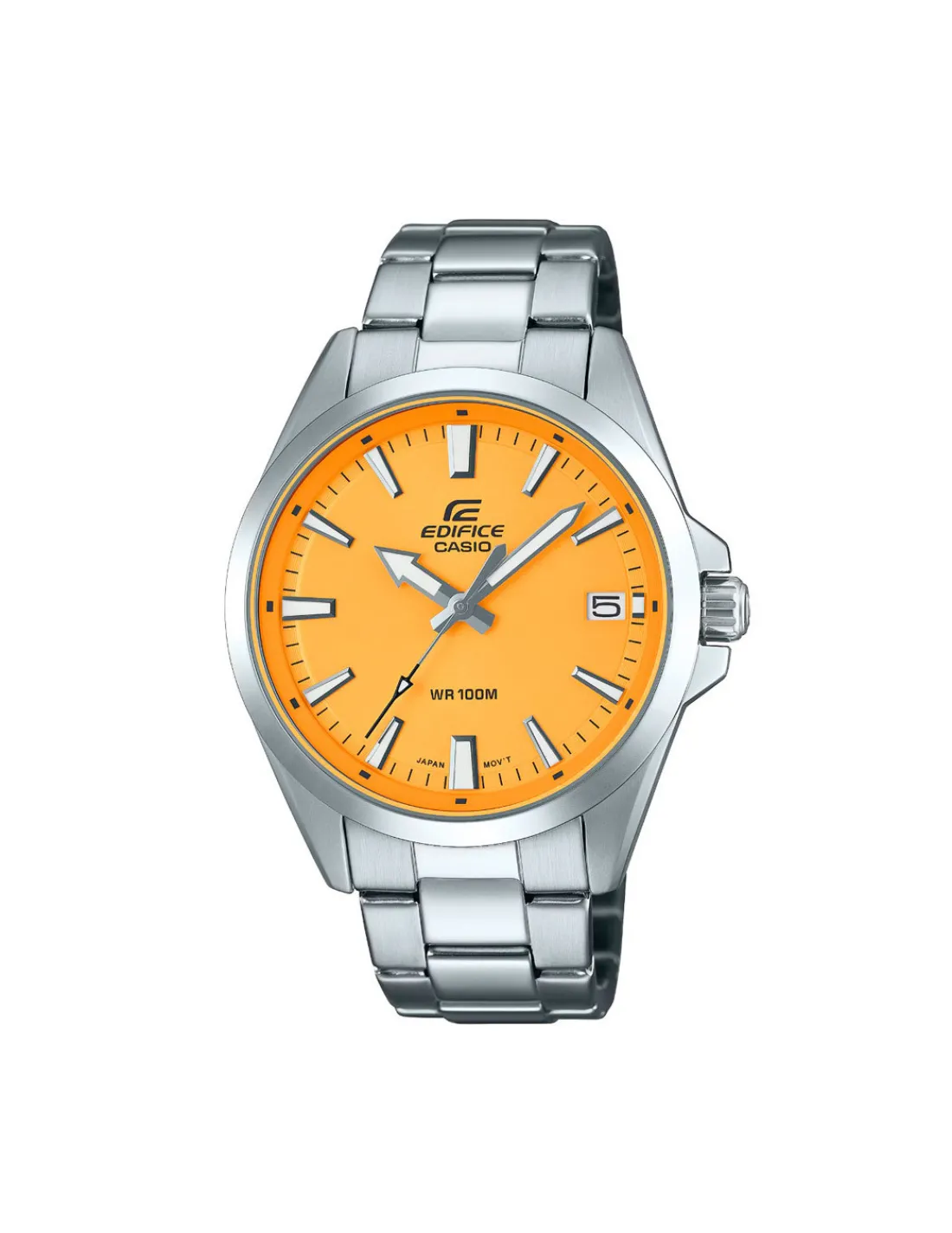 Reloj Casio Edifice EFV-100D-9AVUEF con caja de acero inoxidable, esfera amarilla y brazalete. Movimiento de cuarzo japonés. Sumergible 100 metros.