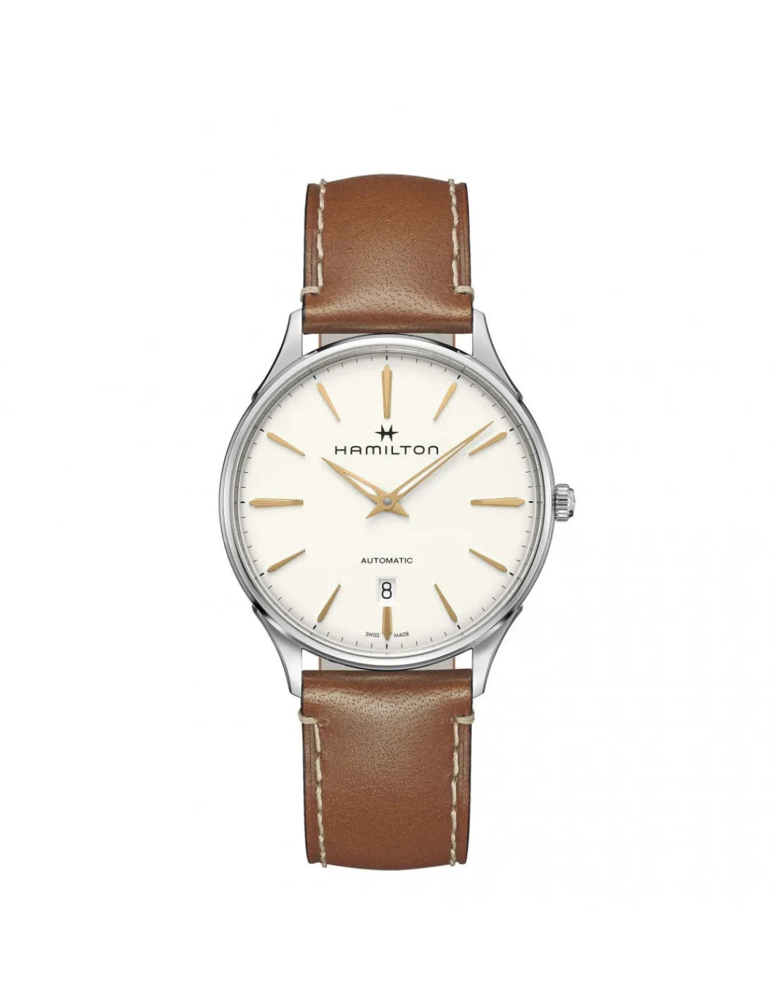 Reloj Hamilton Jazzmaster Thinline H38525512 para hombre con caja de acero, esfera blanca con índices dorados y correa de piel marrón habana. Movimiento automático Swiss Made.