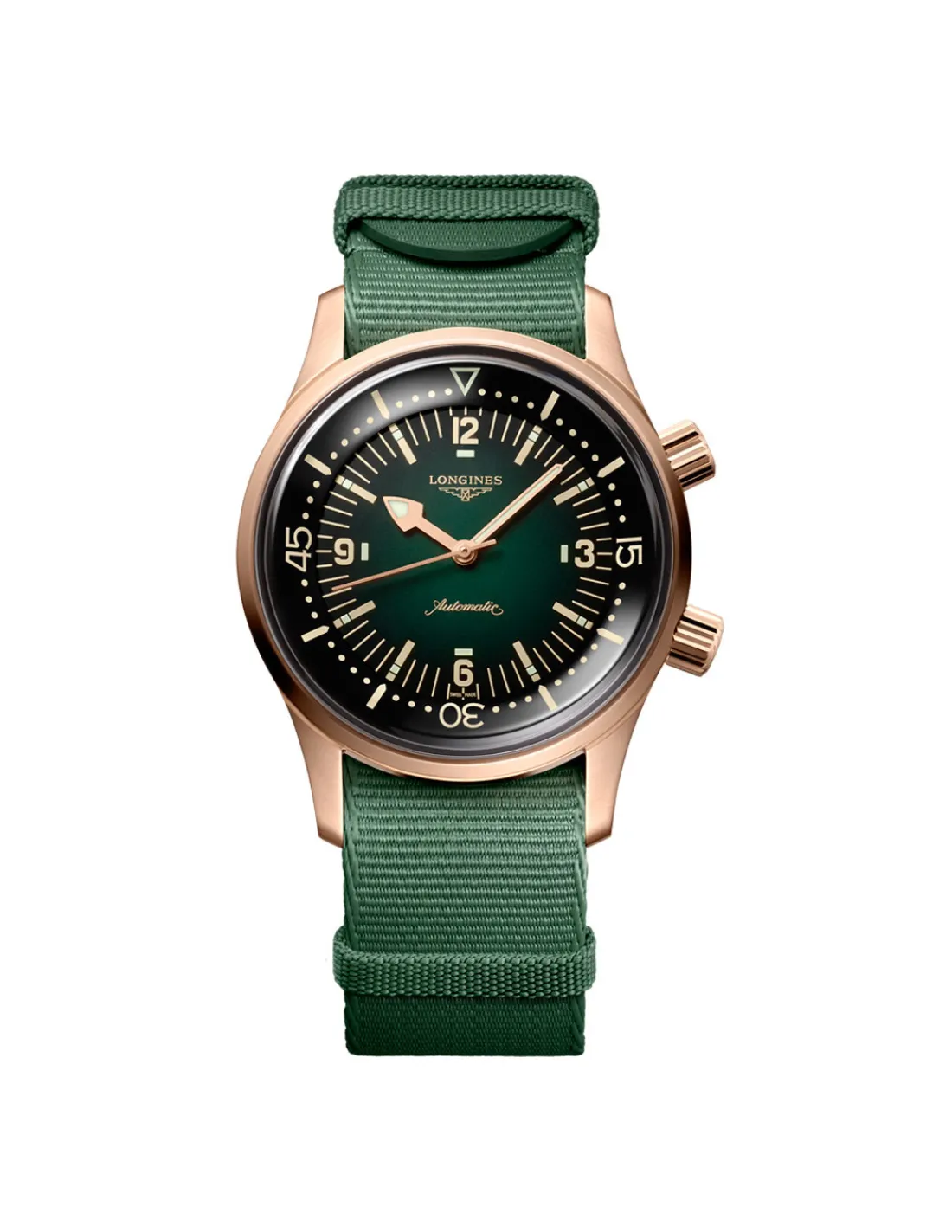 Reloj Longines Legend Diver L3.774.1.50.2 para hombre con caja de bronce con fondo de titanio, esfera verde y correa de piel marrón. Movimiento automático Swiss Made y 72 horas de reserva de marcha.