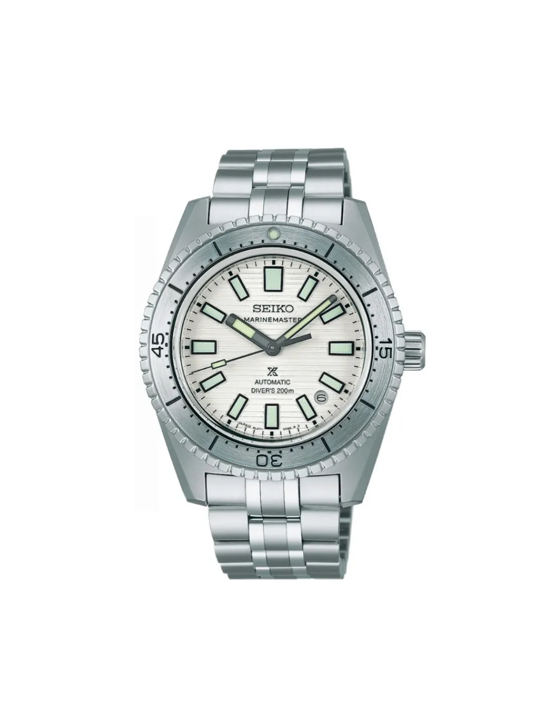 Reloj Seiko Prospex Marinemaster 1965 Divers Modern Re-interpretation para hombre con caja de acero, esfera blanca y brazalete. Movimiento automático con capacidad de carga manual.