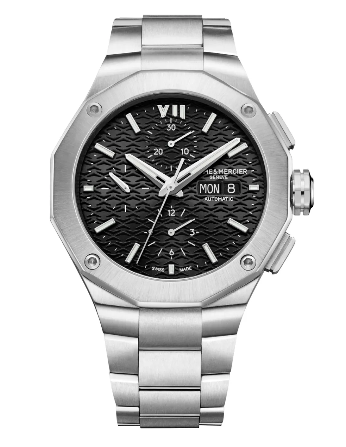 Reloj Baume et Mercier Riviera 10624 para hombre con brazalete y caja de acero combinado con esfera negra con acabado satinado soleil. Movimiento cronógrafo automático Swiss Made.