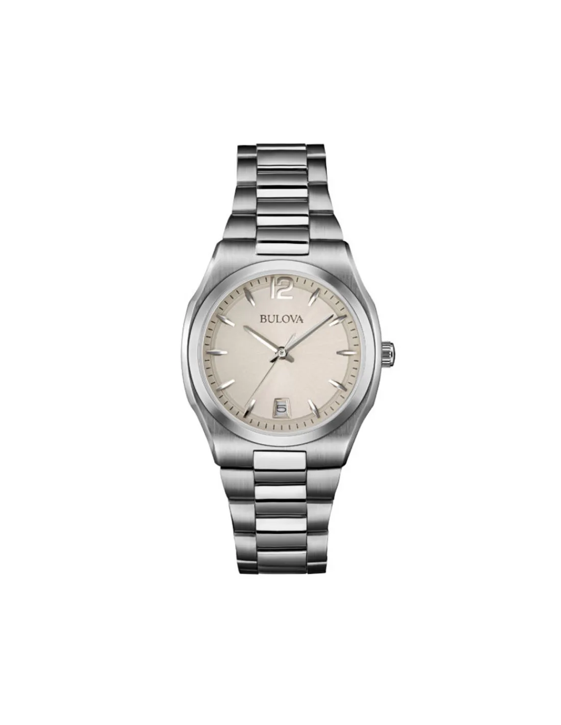Reloj Bulova Surveyor Lady con caja de acero de 34 mm, esfera color beige y cristal mineral combinado con brazalete de acero. Movimiento de cuarzo.
