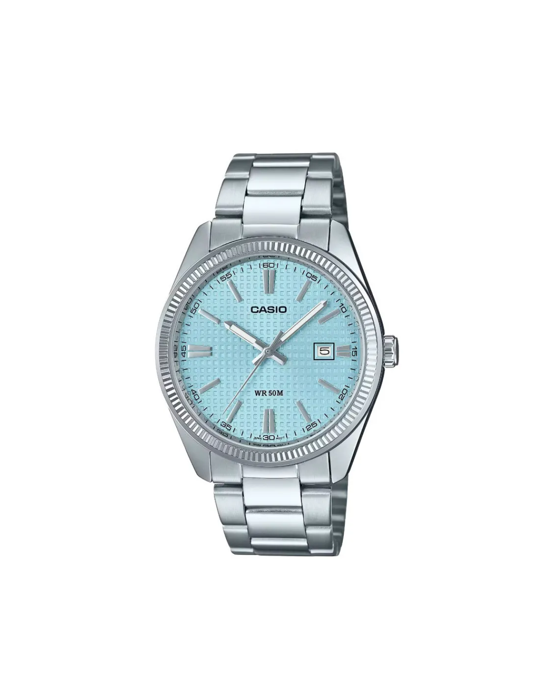 Reloj Casio Timeless MTP-1302PE-2AVEF con carcasa y bisel ionizado, esfera celeste y brazalete. Sumergible 50 metros. Movimiento de cuarzo.
